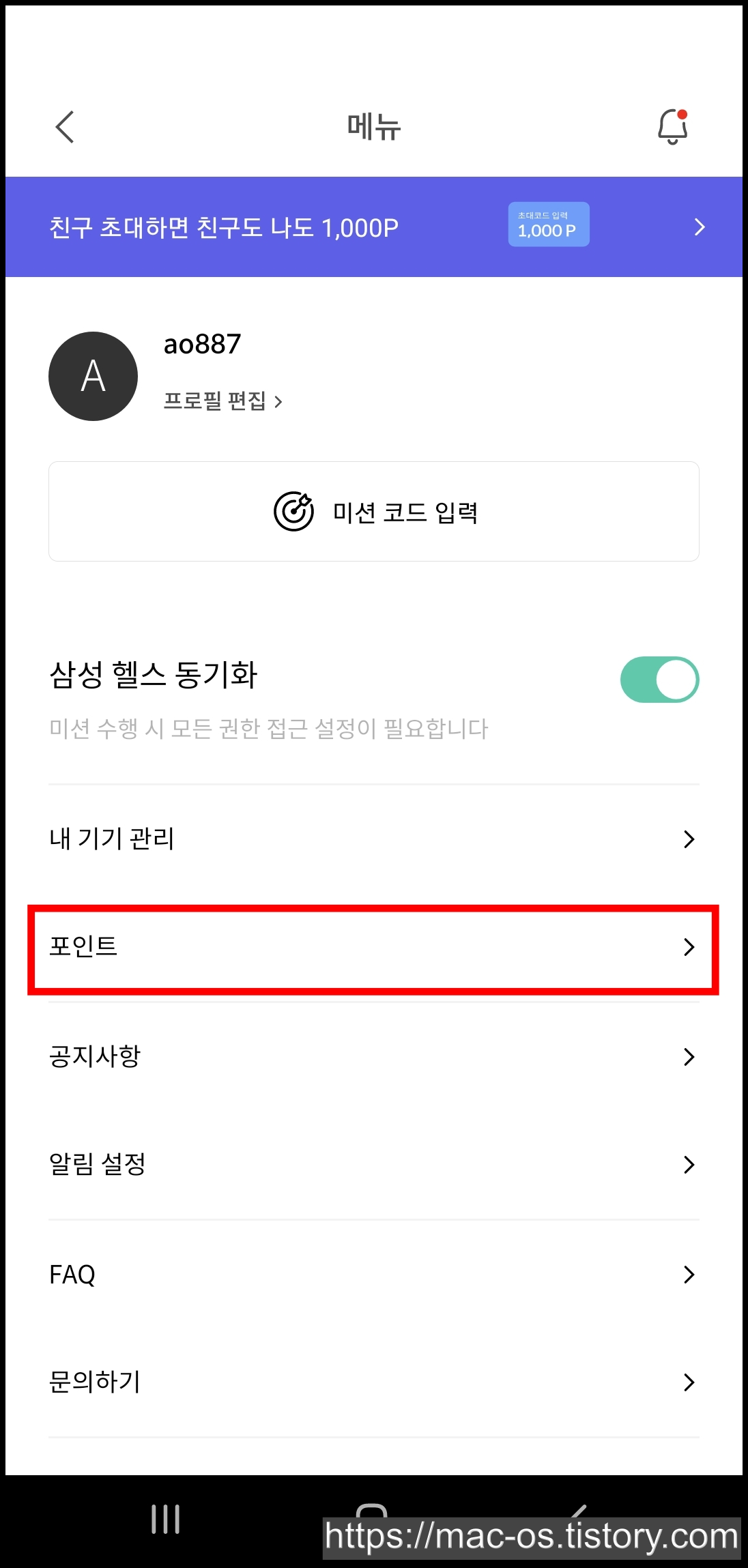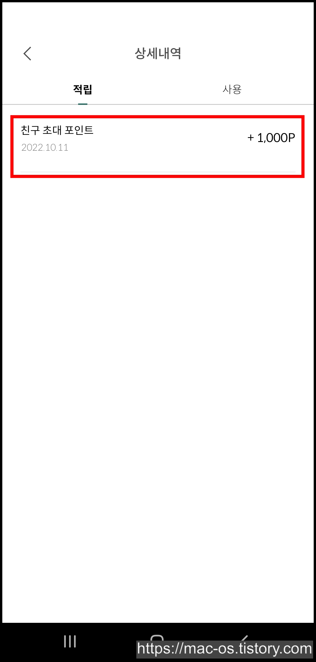 1,000P가 들어온 것을 확인할 수 있는데, 추천코드를 입력해서 받은거에요. 추천코드를 입력하지 않았다면 0P구요.