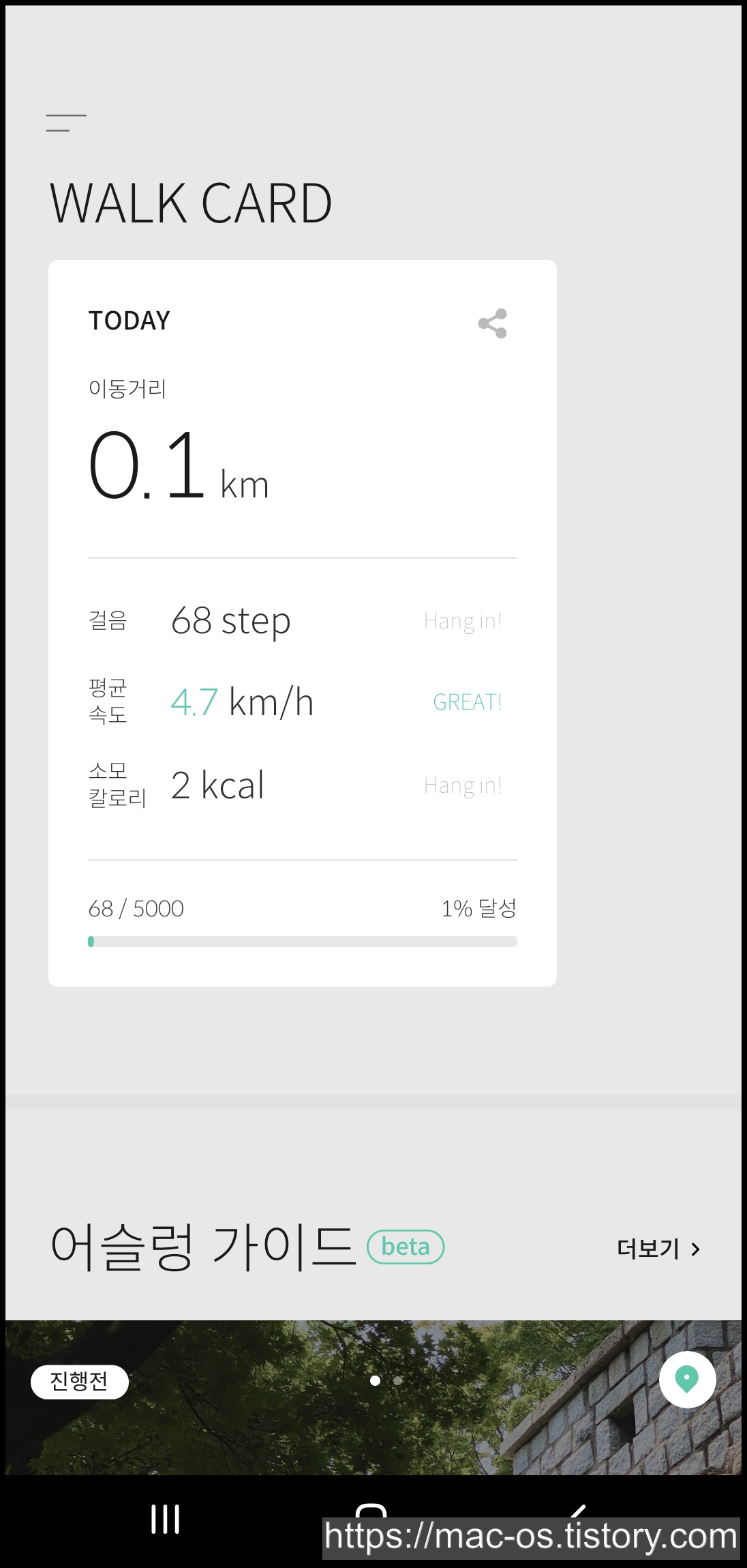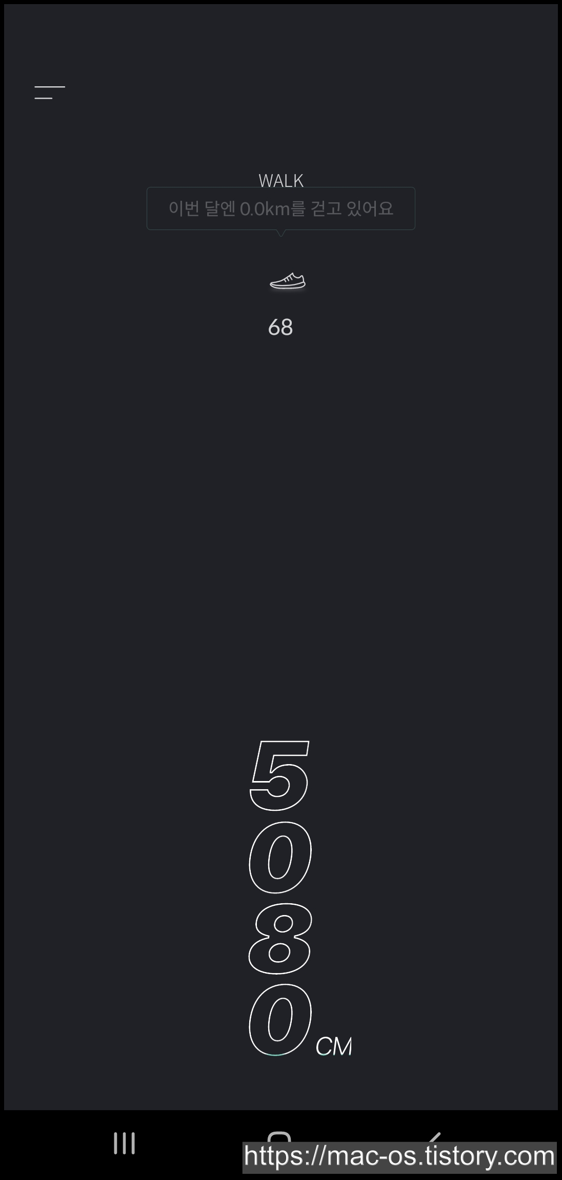 삼성 헬스 앱과 연동되어서 휴대폰을 들고 걸으면 이렇게 걸음 수와 CM가 표시돼요.