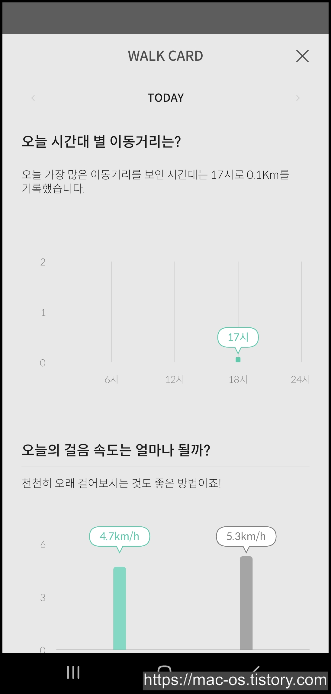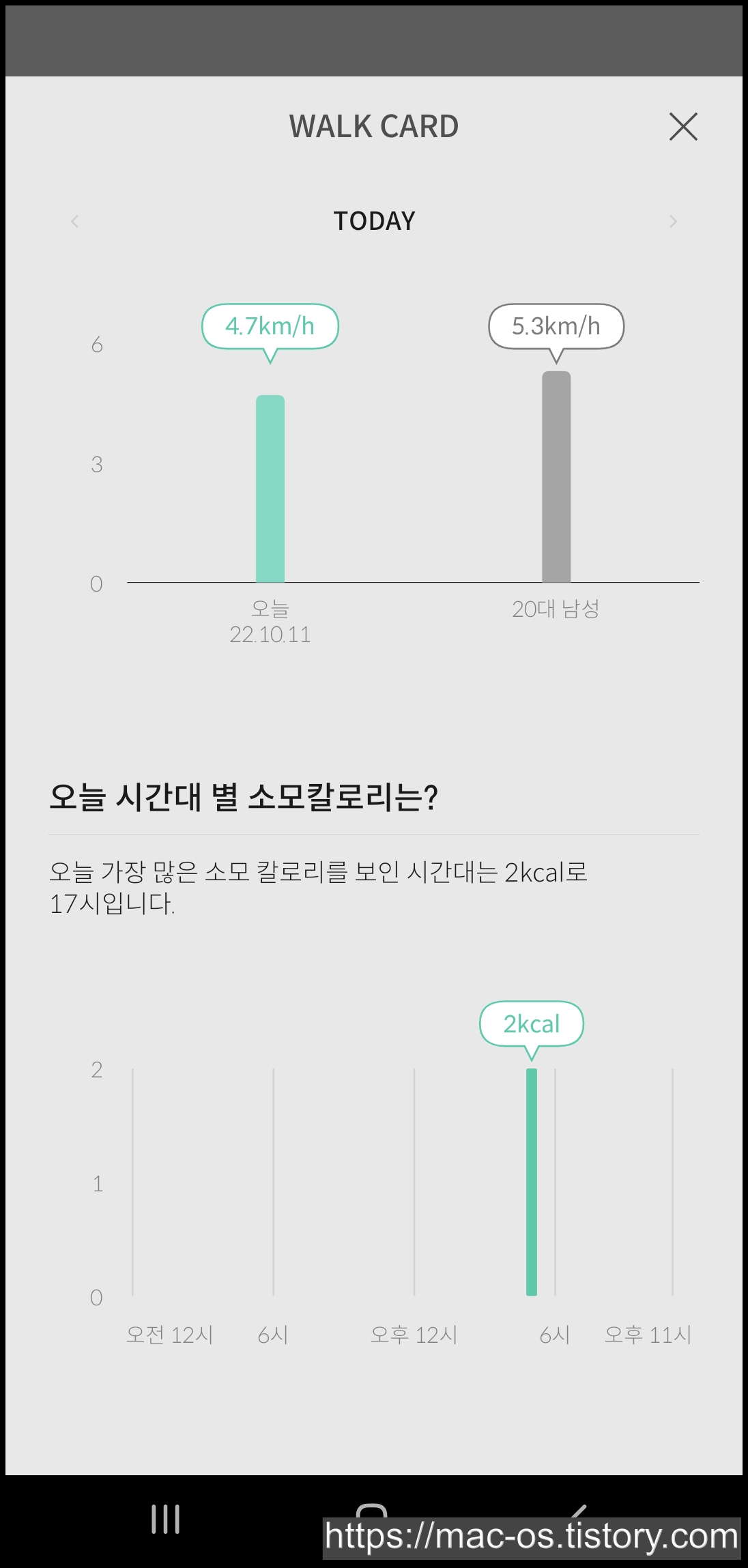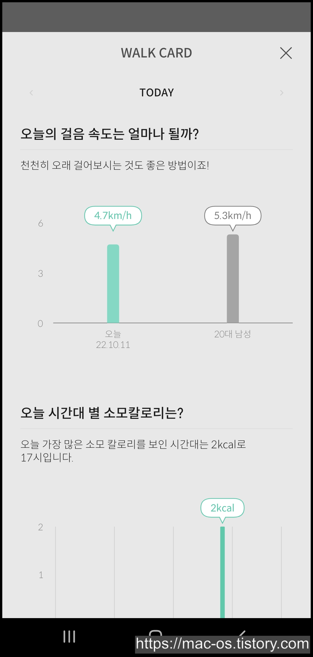 오늘 시간대 별 이동거리와 걸음 속도, 소모칼로리 등을 한눈에 파악할 수 있어요.