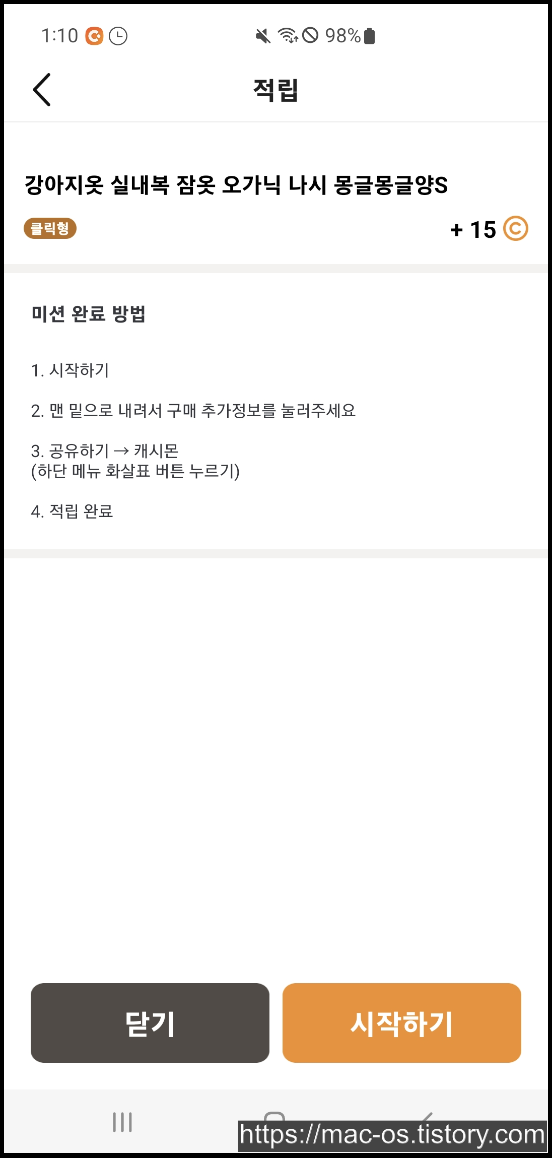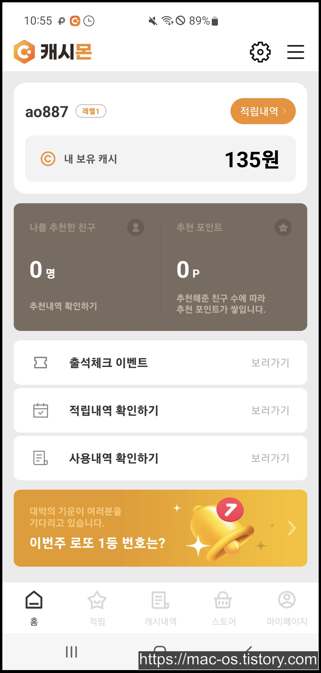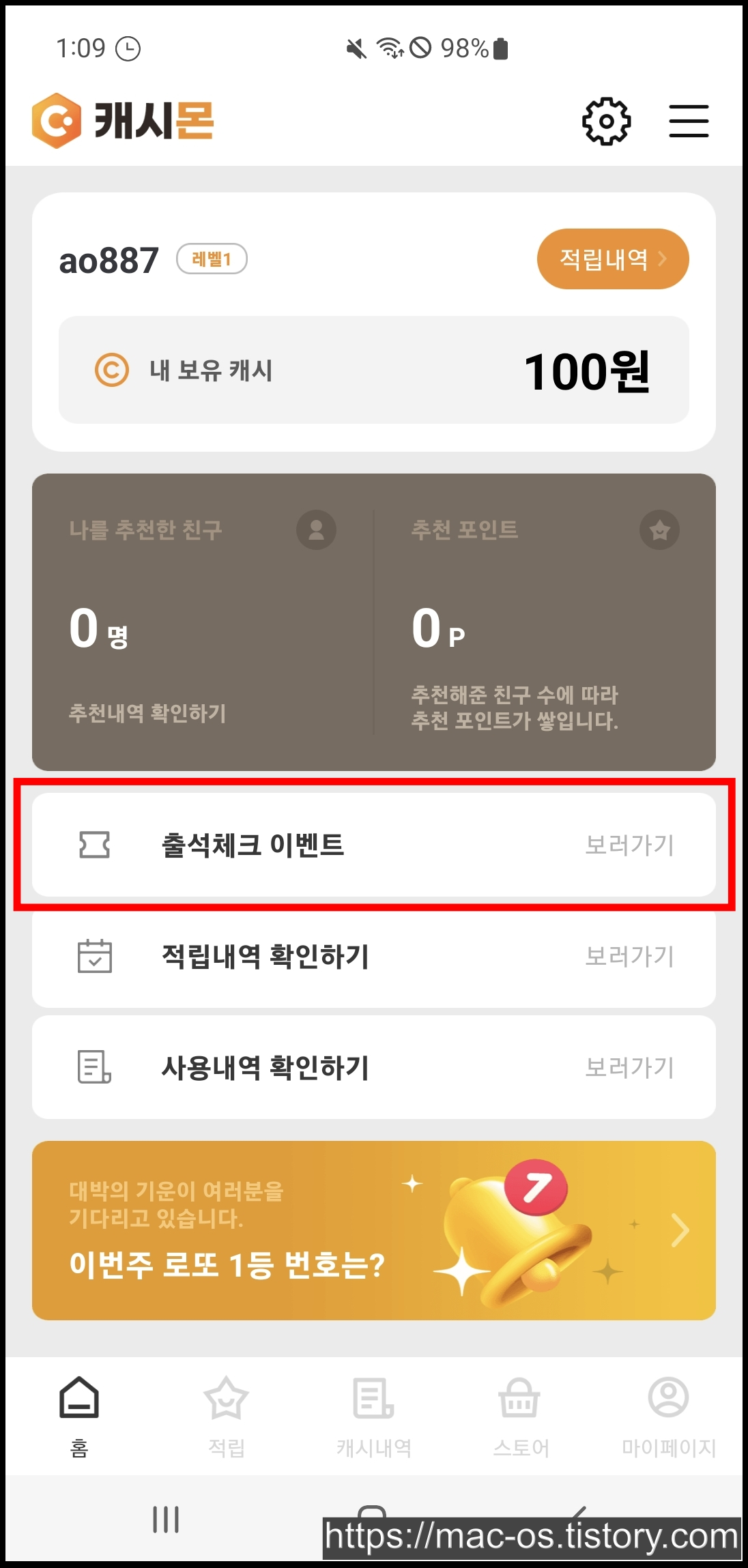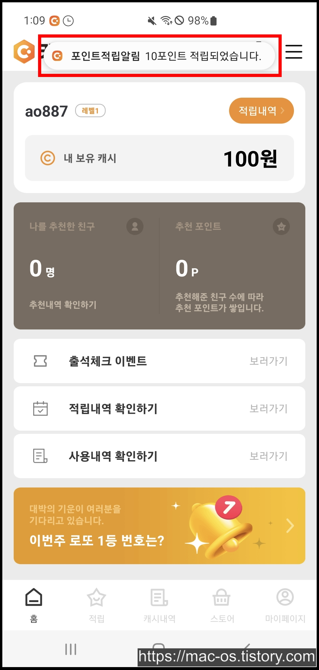 홈 화면에 있는 [출석체크 이벤트]를 클릭하면 10원이 적립돼요.
