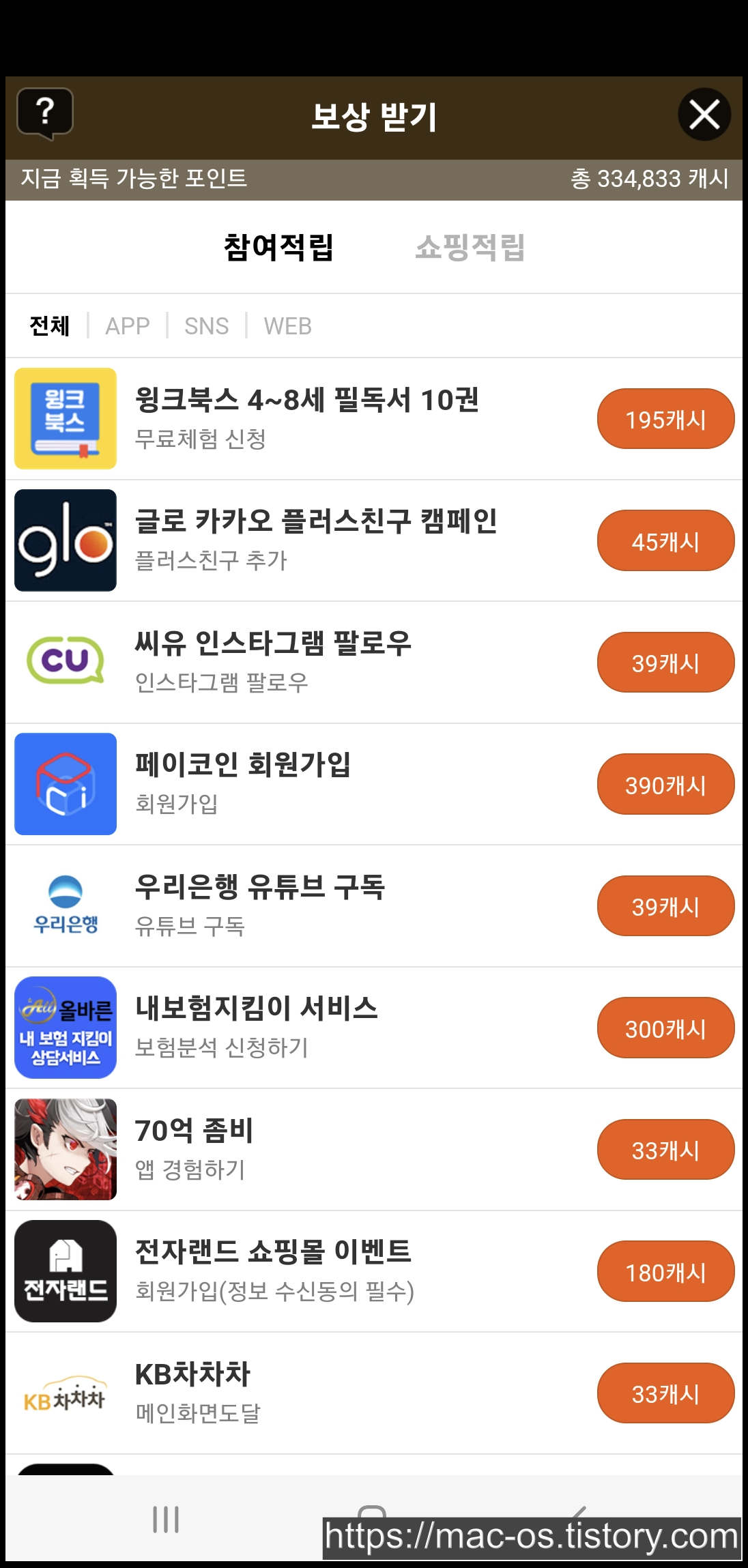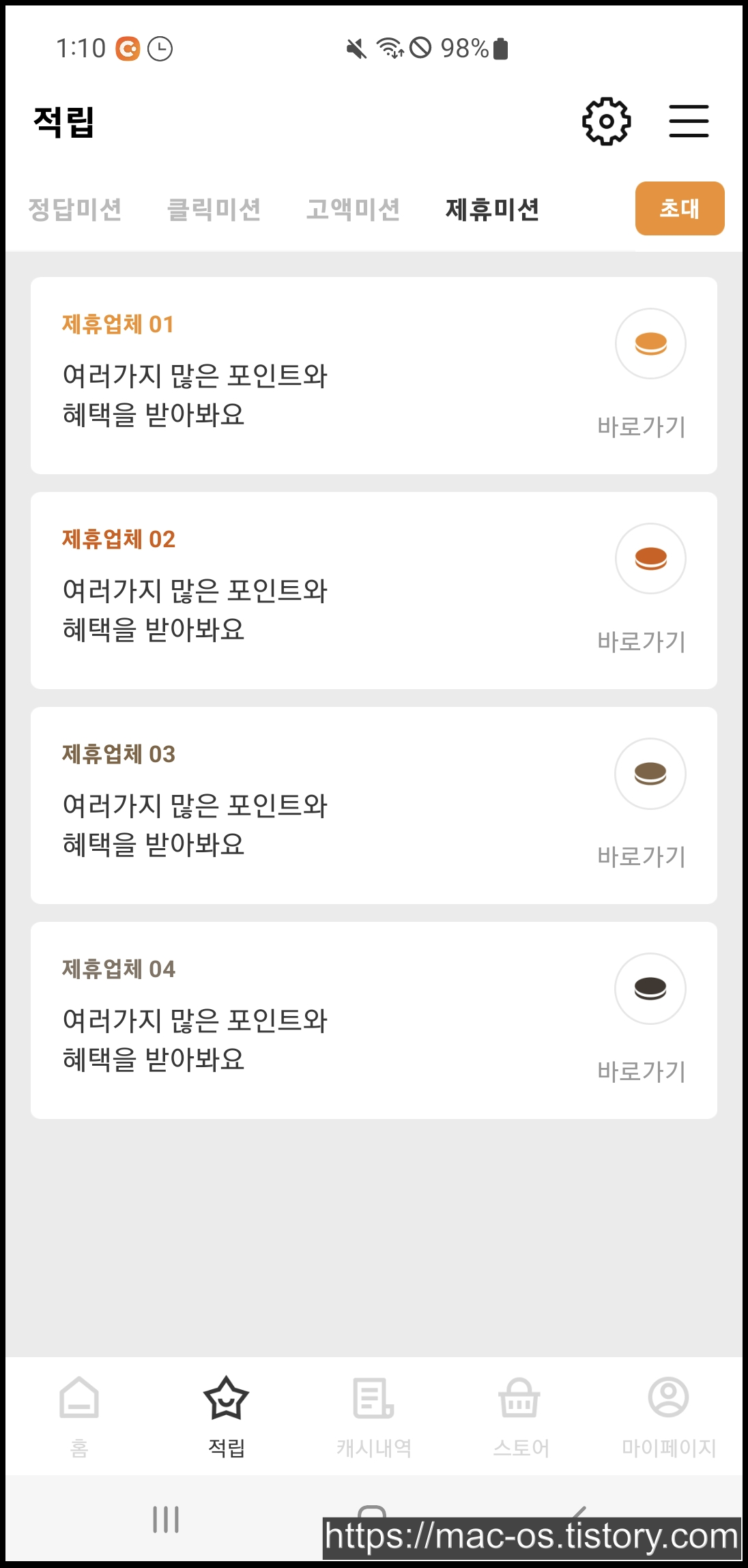 - 앱 특징 : 다양한 미션에 참여하여 포인트를 얻고, 얻은 포인트를 기프티콘 구매나 현금 출금에 사용할 수 있음.