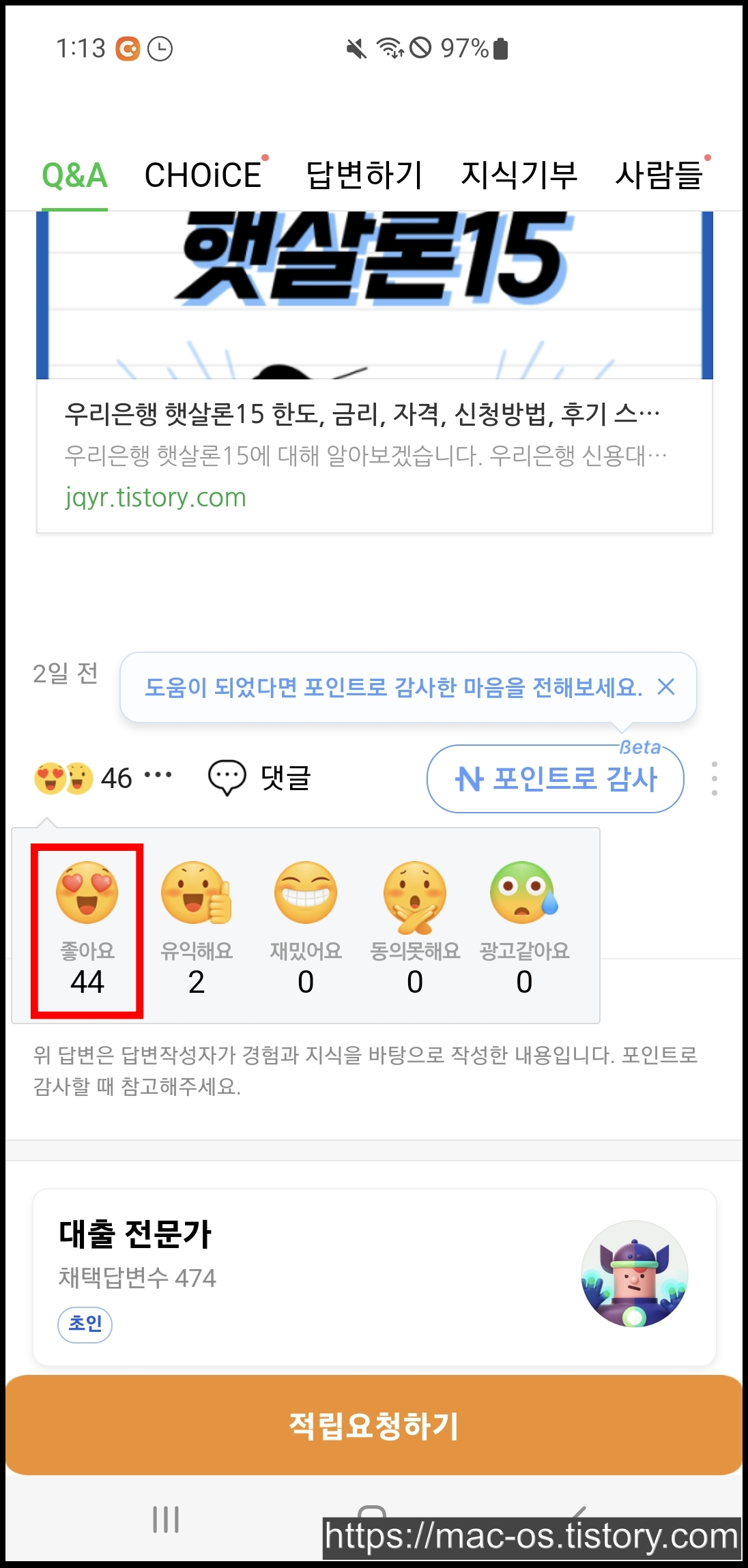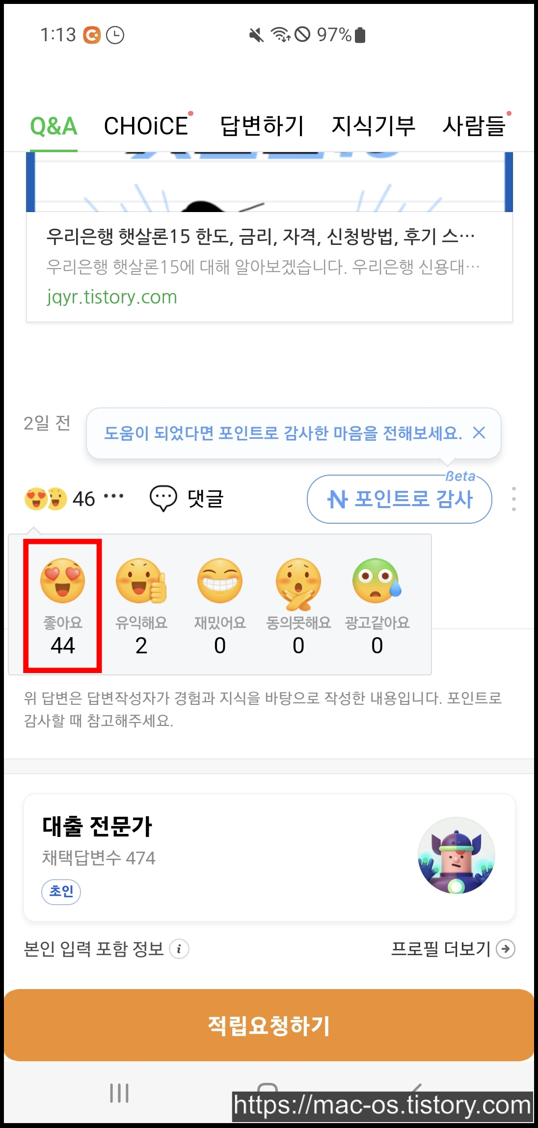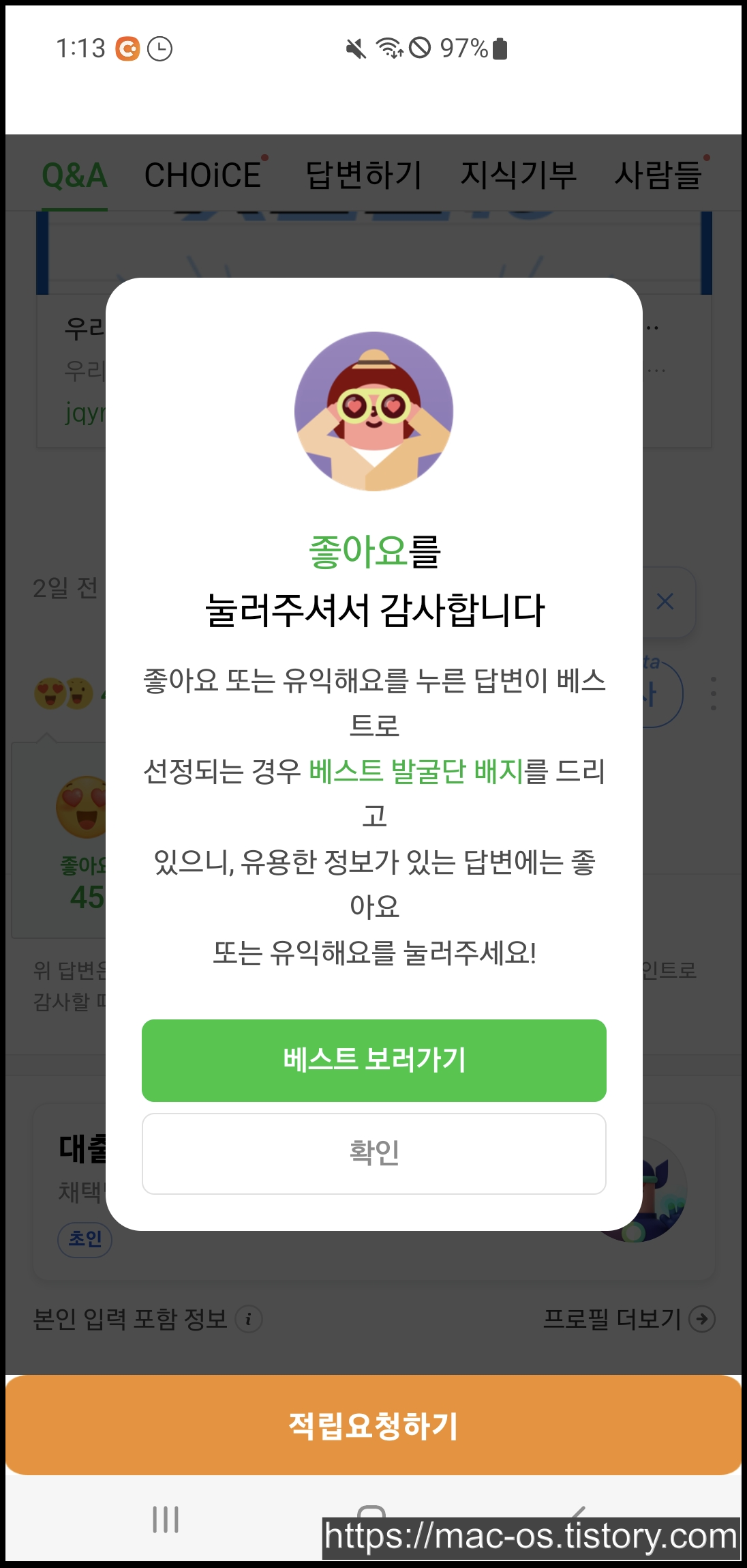 지식인 답변 아래 부분에 표정을 누를 수 있는데