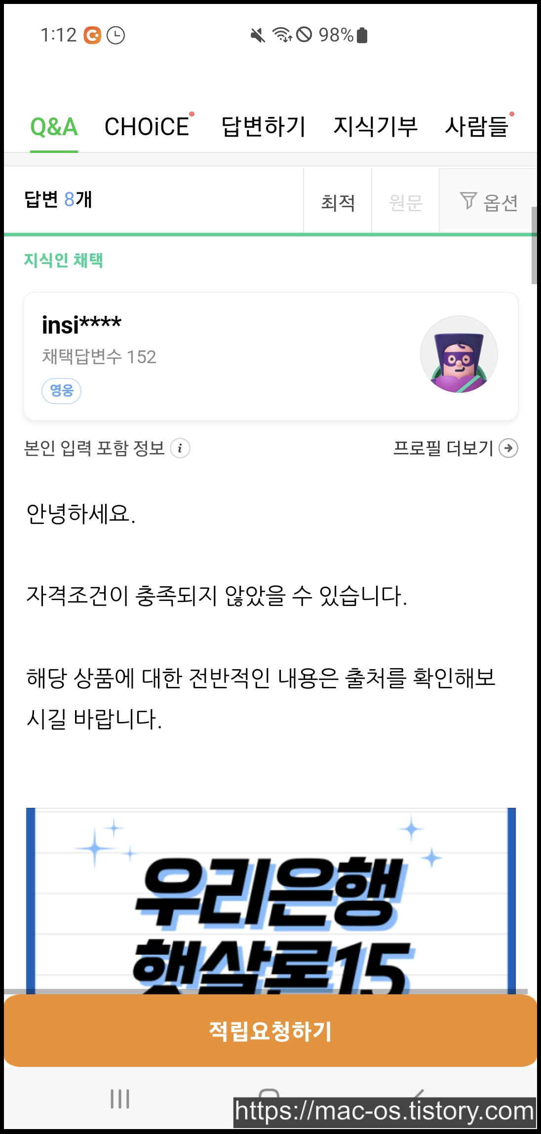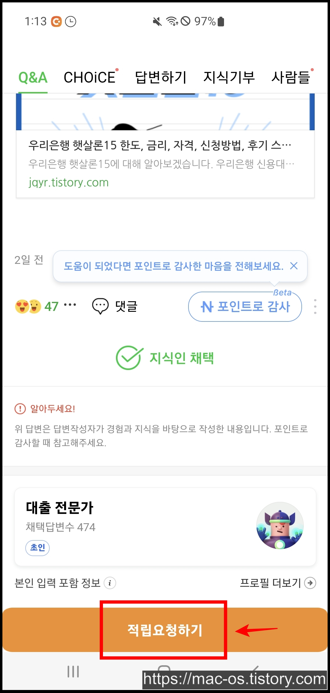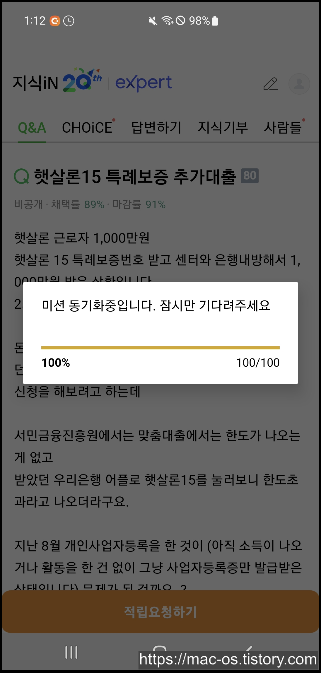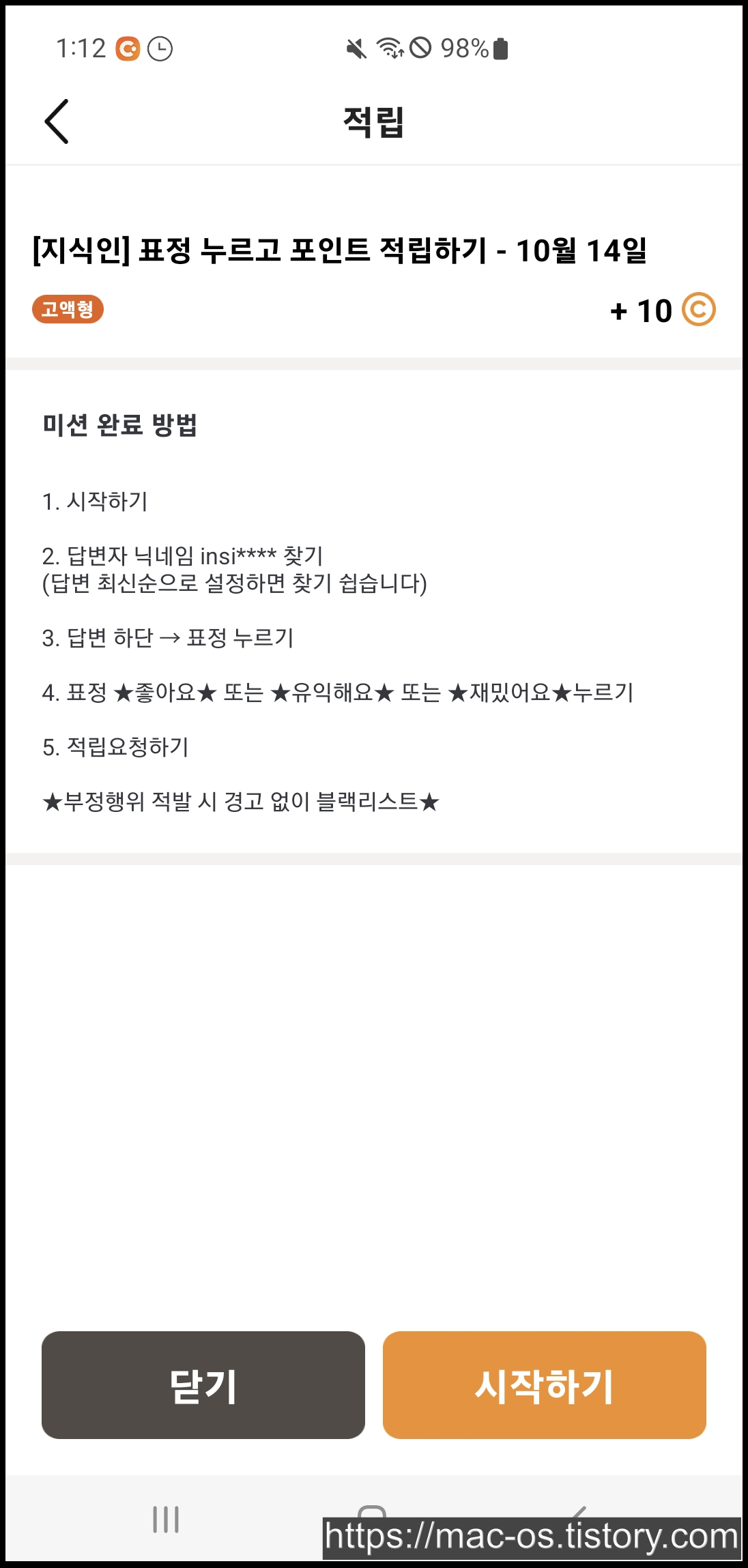 고액미션에서 [시작하기]를 누르면 네이버 지식인 페이지로 이동하게 돼요.