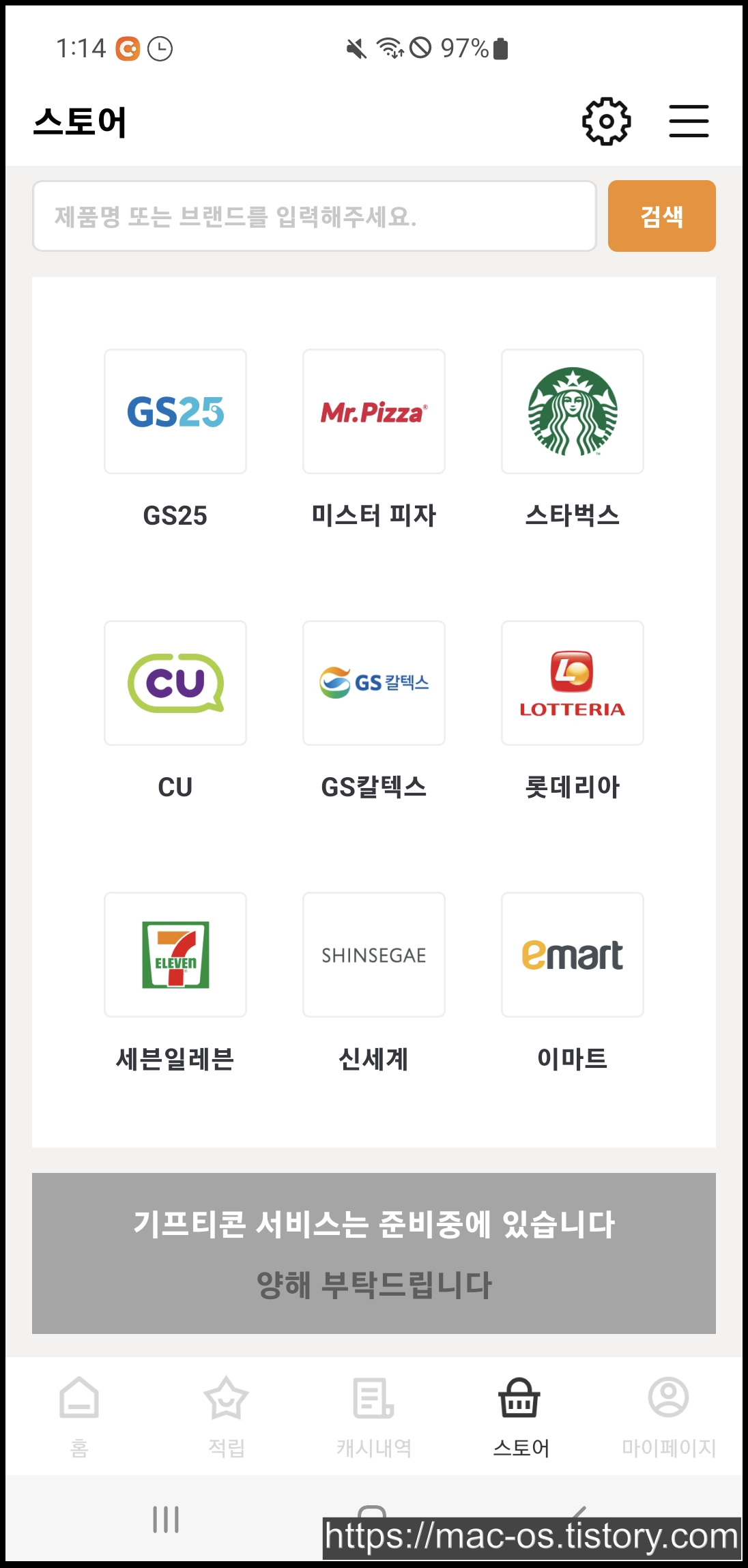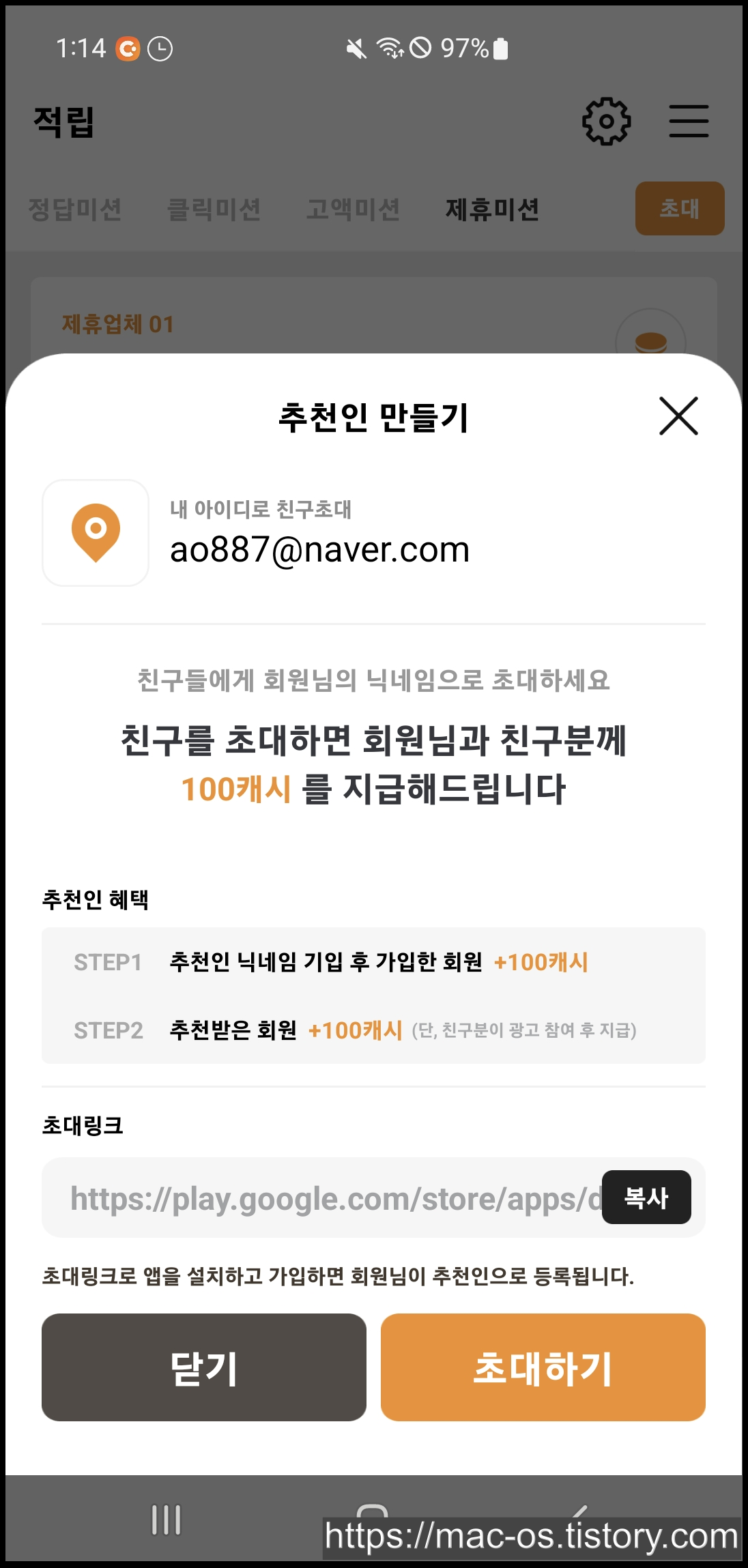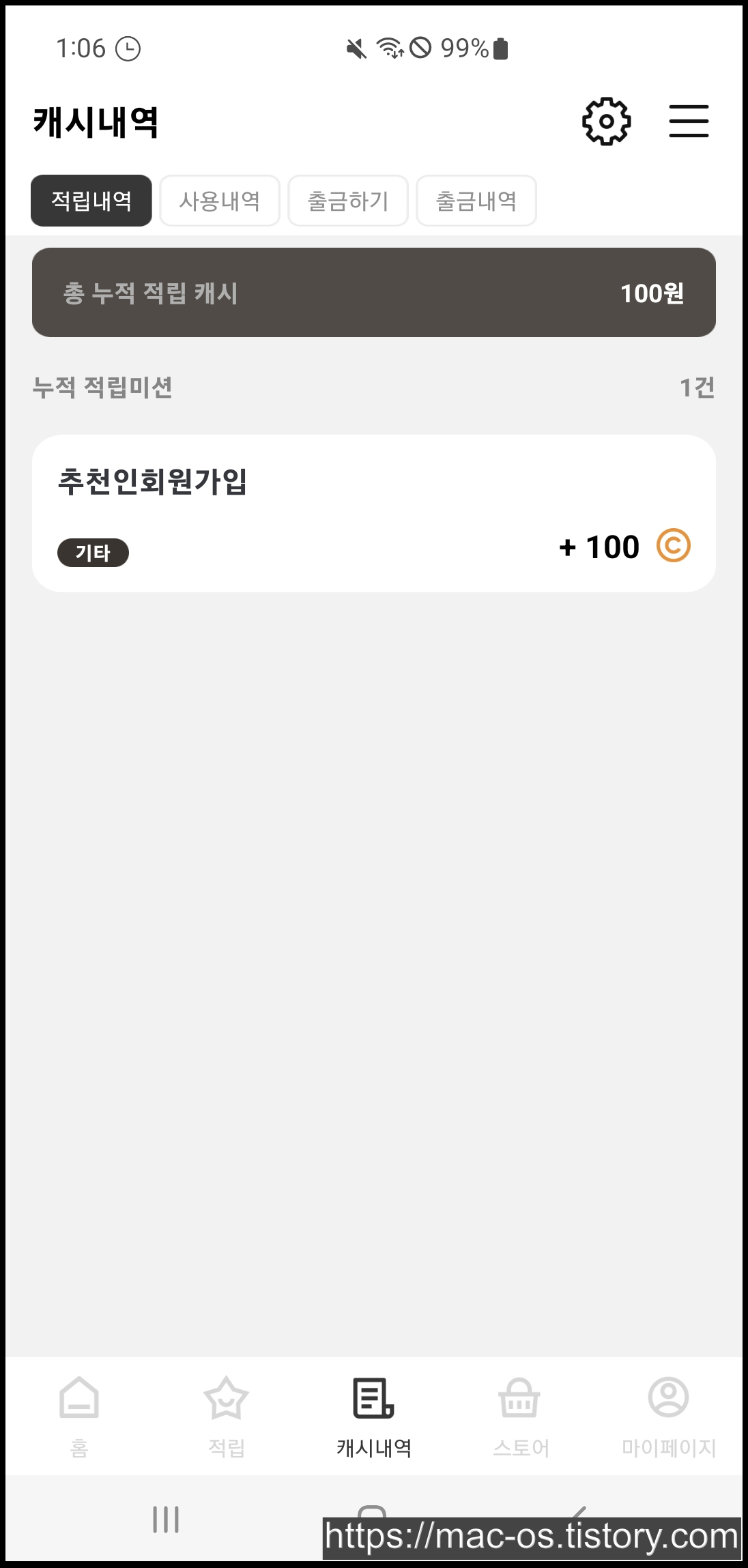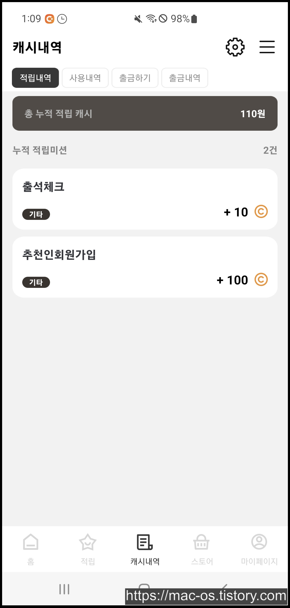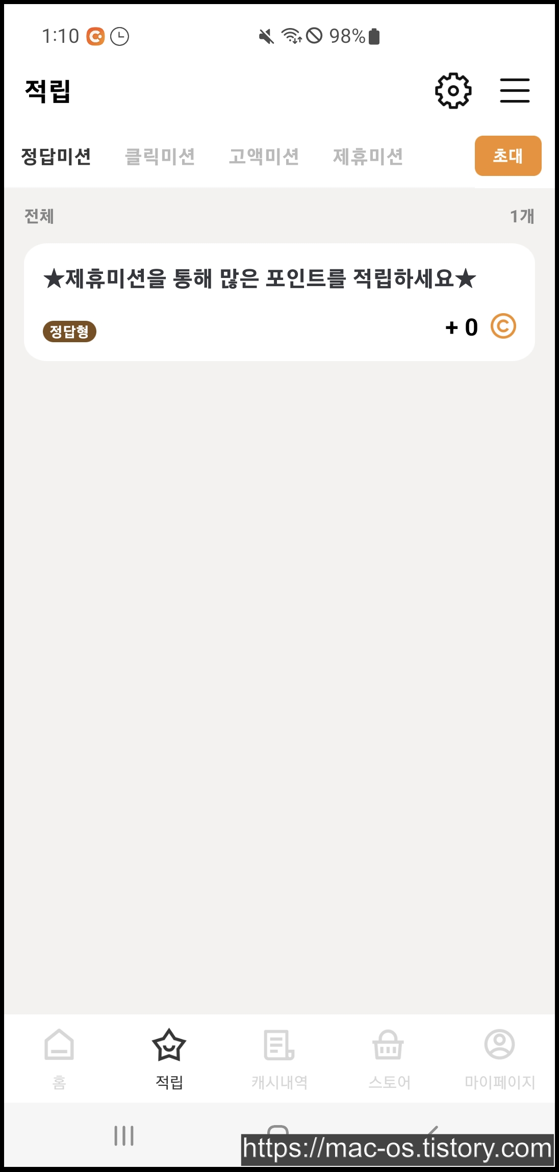 초대한 친구가 미션에 참여하면 친구와 나 모두 100원을 받을 수 있어요. 이렇게 미션이나 초대를 통해 얻은 포인트는 기프티콘 구매나 현금 출금으로 사용이 가능한데, 지금 기프티콘 서비스는 준비중이라고 하네요.