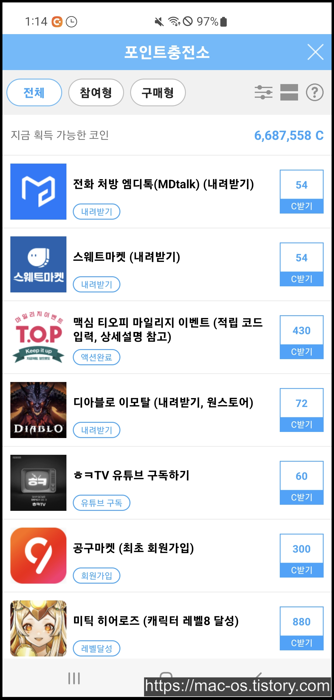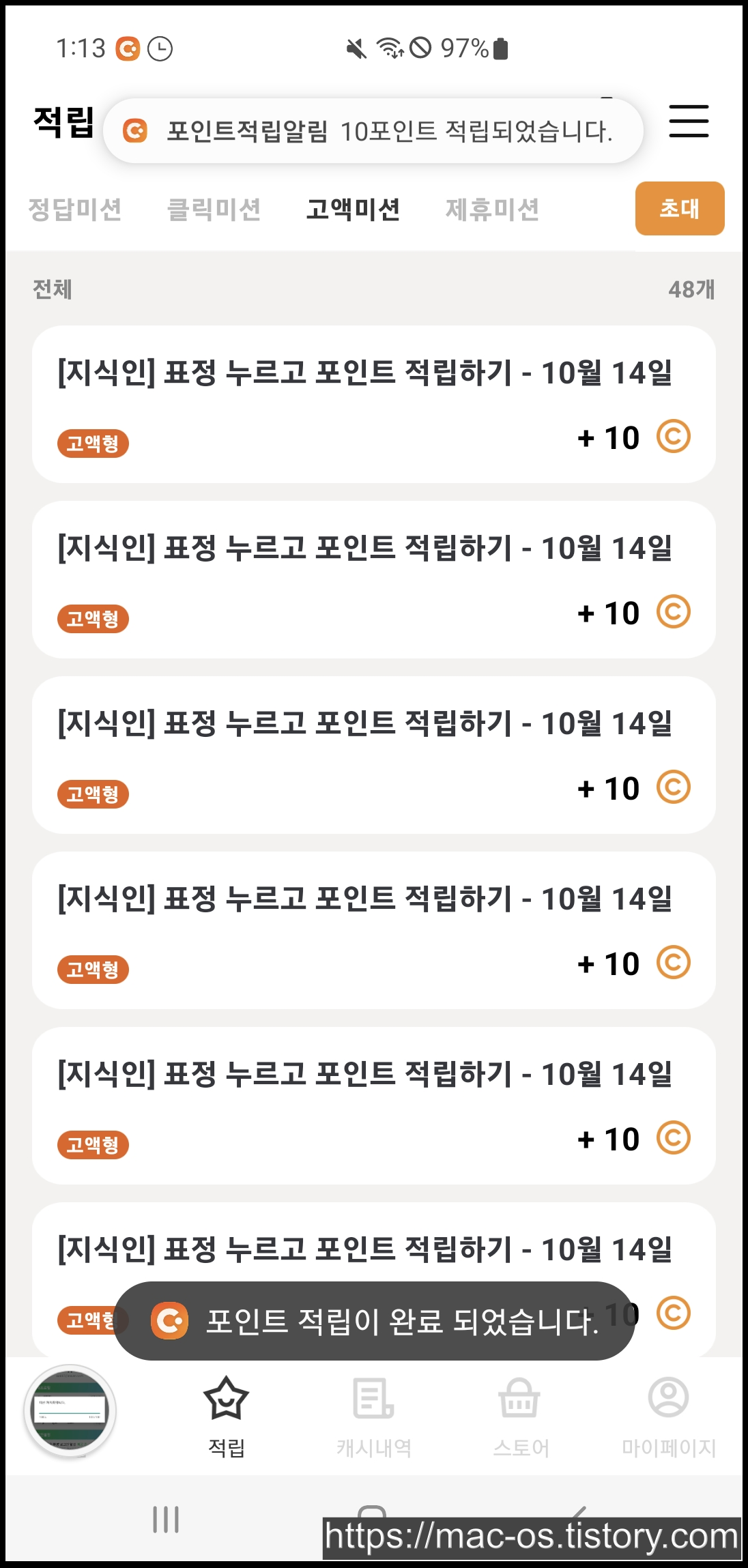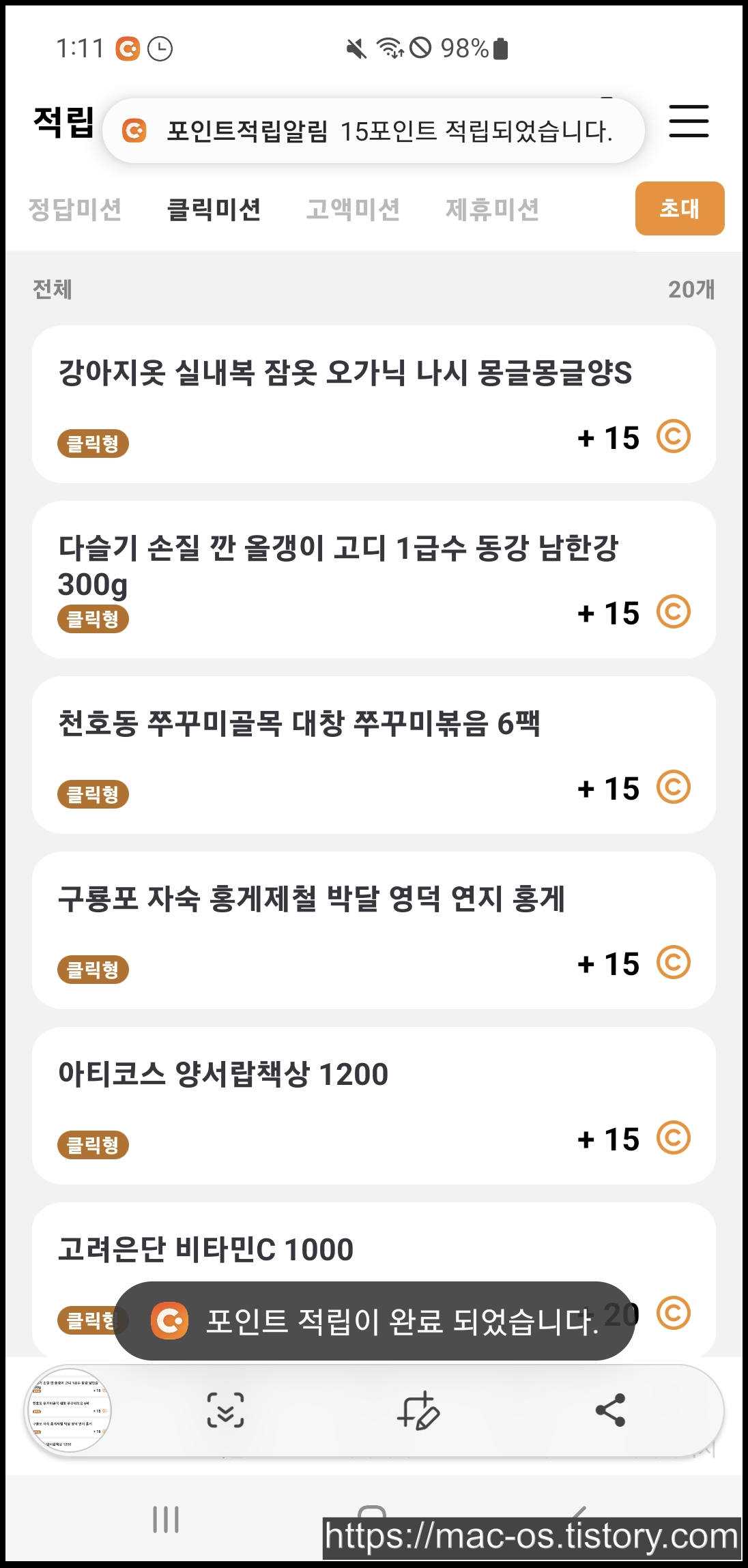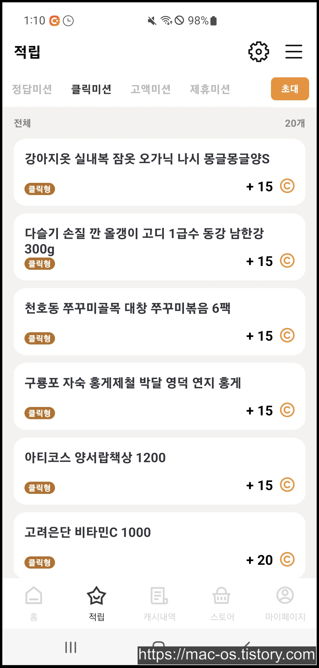 현재는 클릭미션과 고액미션, 제휴미션이 많이 있는 상태예요. 일단 클릭미션부터 참여해볼게요.