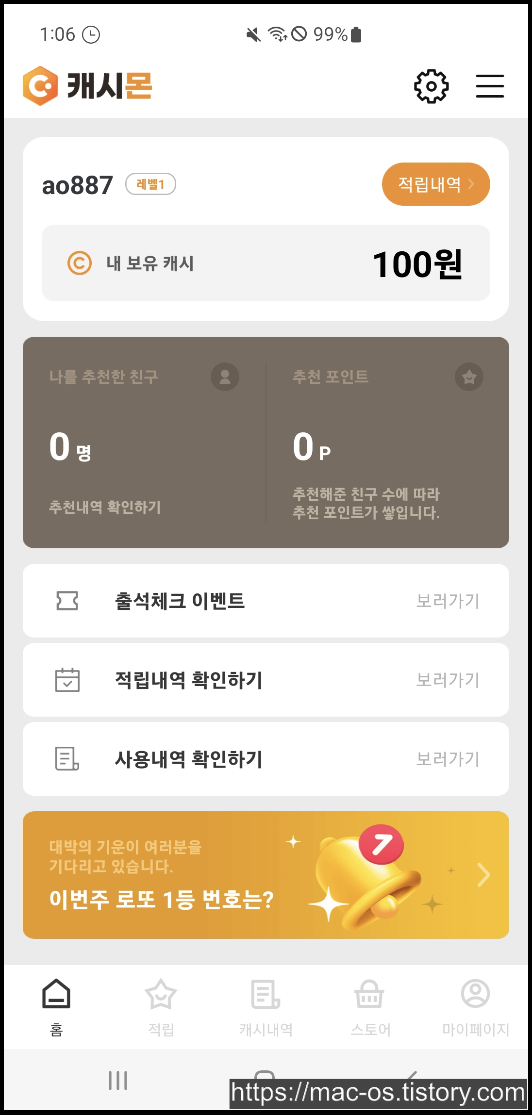 그리고 [캐시몬]을 클릭해주면 포인트가 적립돼요.