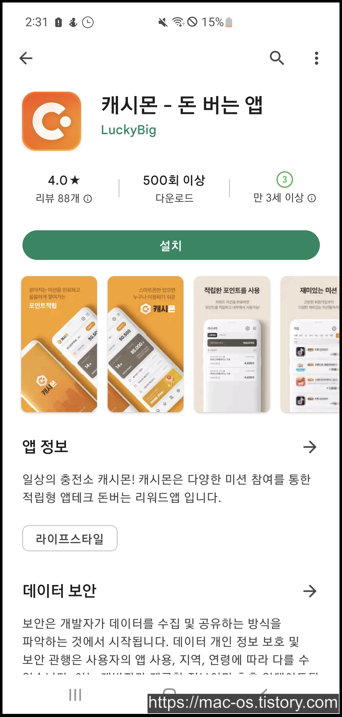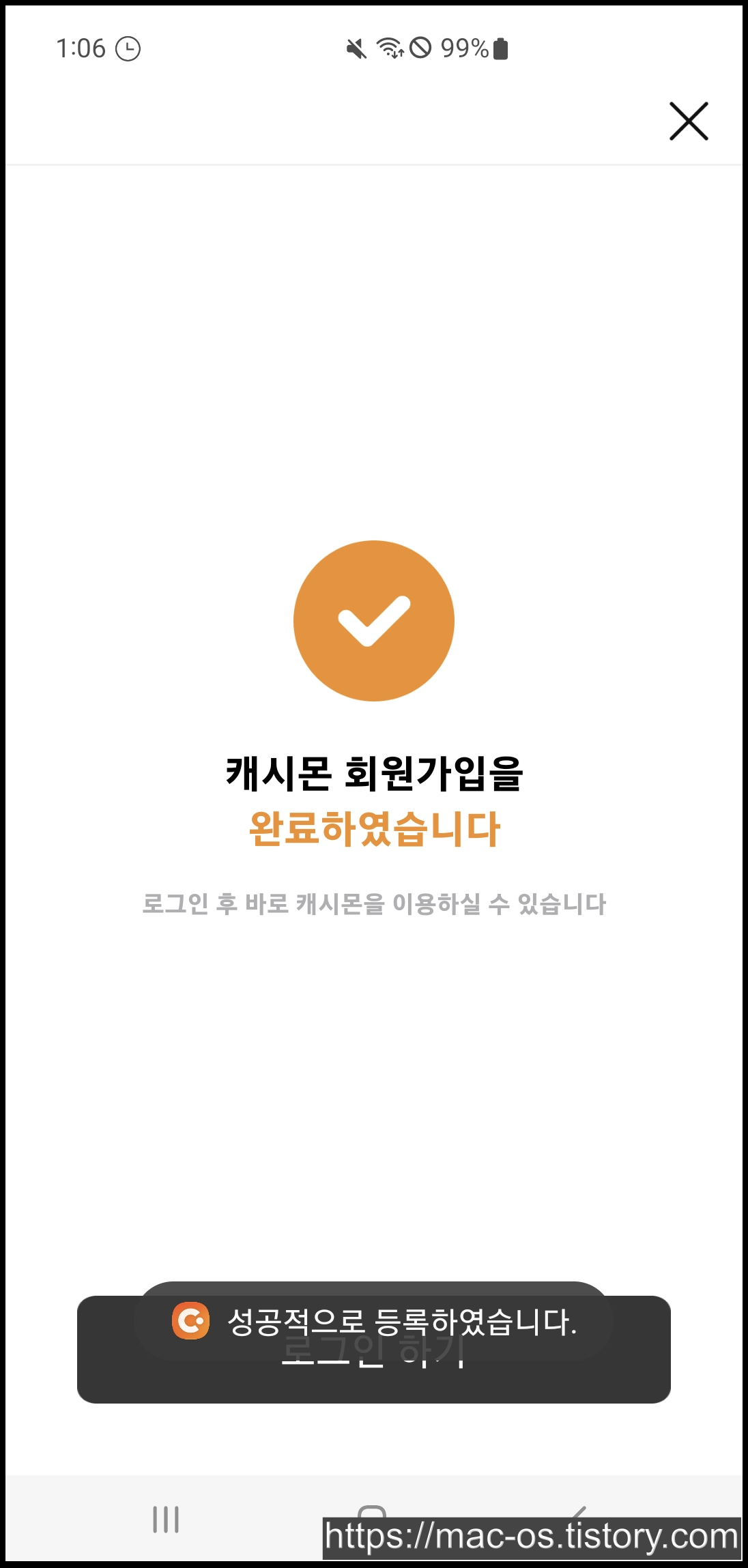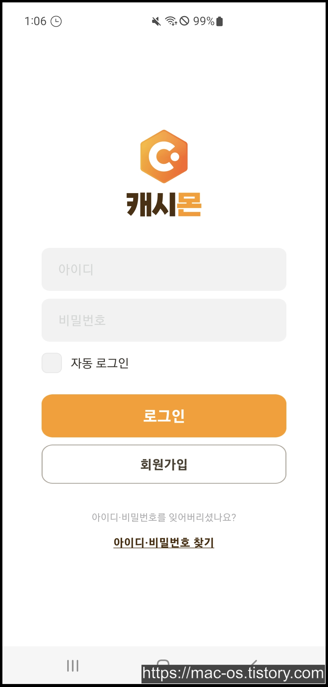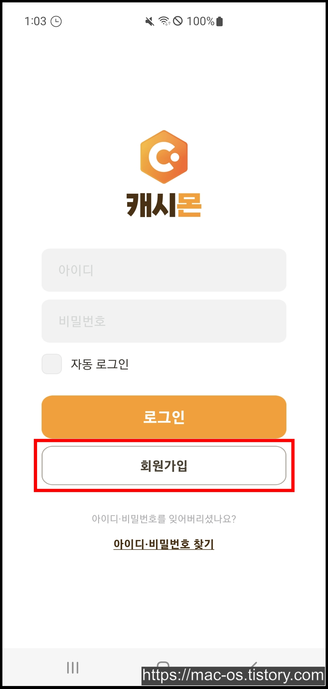 구글 플레이 스토어에서 캐시몬 앱을 설치하고 [회원가입]을 클릭해주세요.