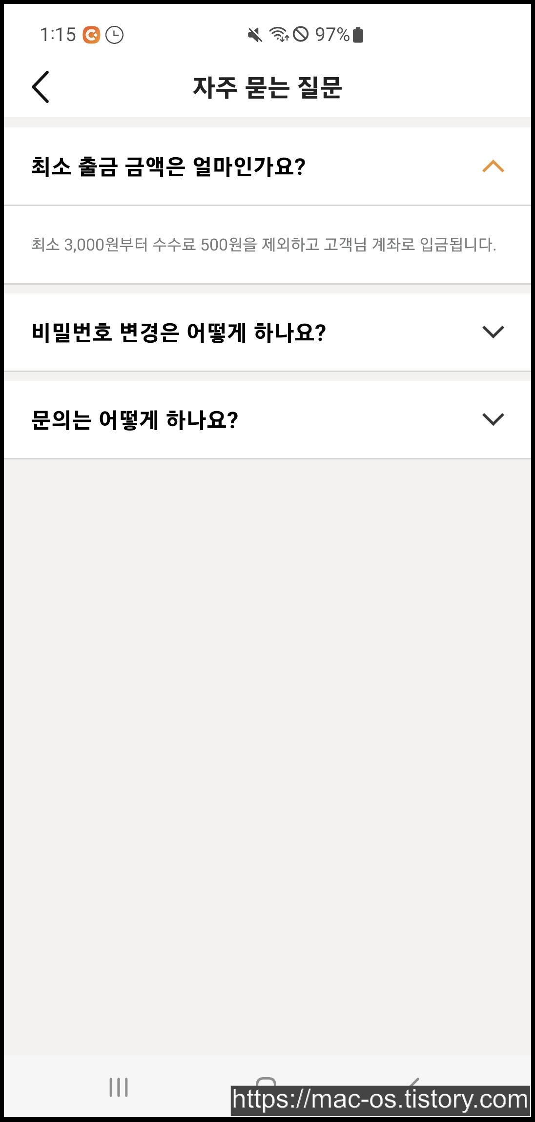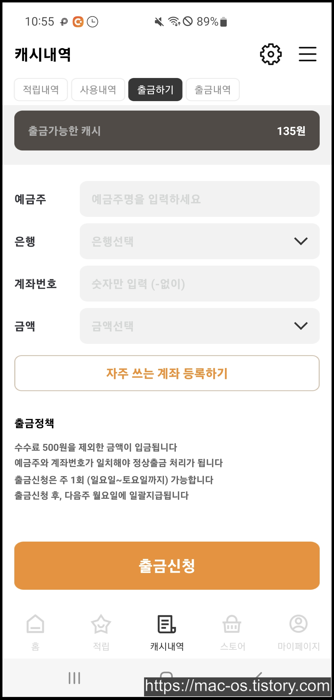 현금 출금은 [적립내역] > [출금하기]에서 할 수 있는데요. 최소 출금 금액은 3천원부터, 수수료 500원을 제외하고 계좌로 입금된다고 하네요.