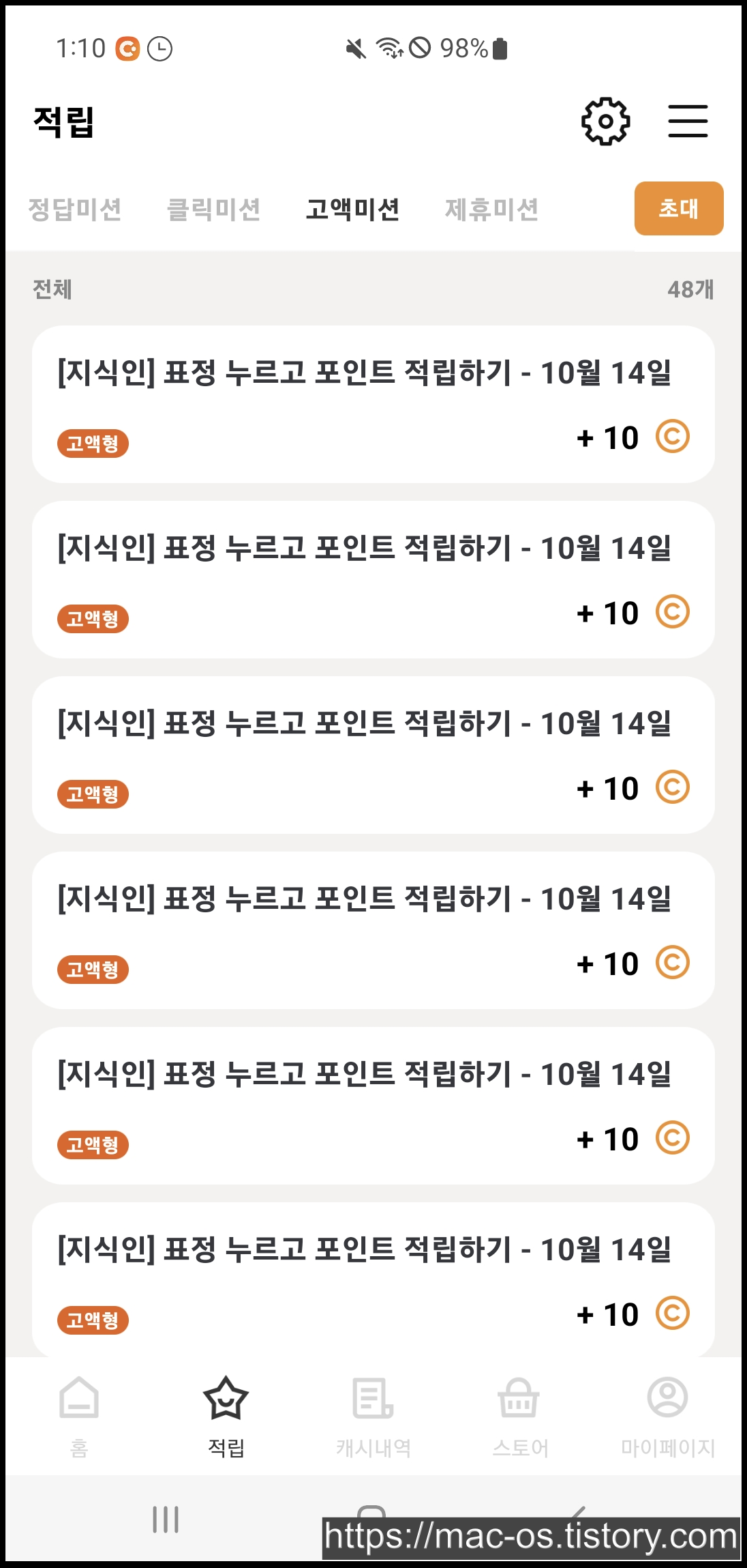 캐시몬에서는 정답미션, 클릭미션, 고액미션, 제휴미션에 참여할 수 있는데요.