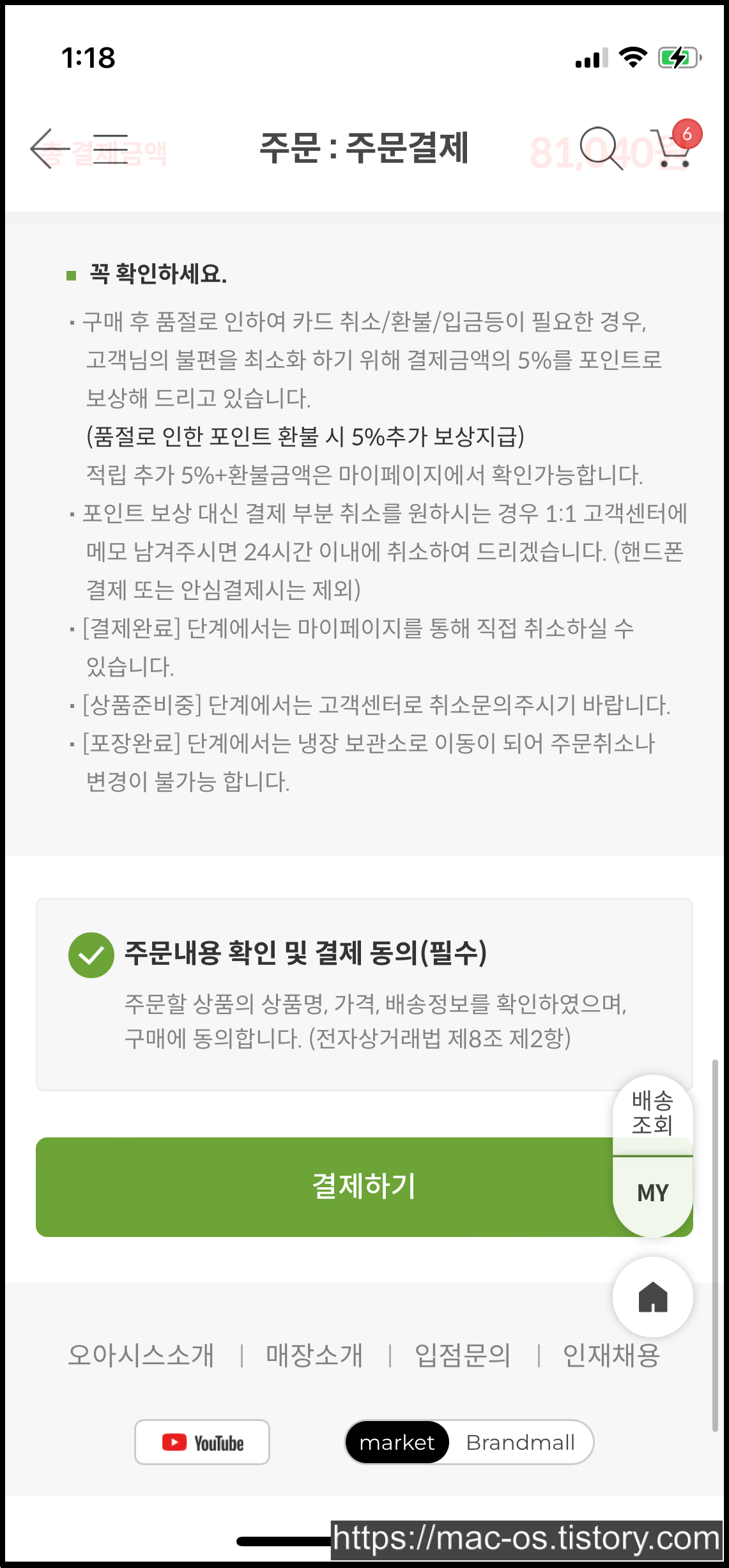 결제 페이지에서 주문/배송정보 확인 후 [주문하기]를 누릅니다.
