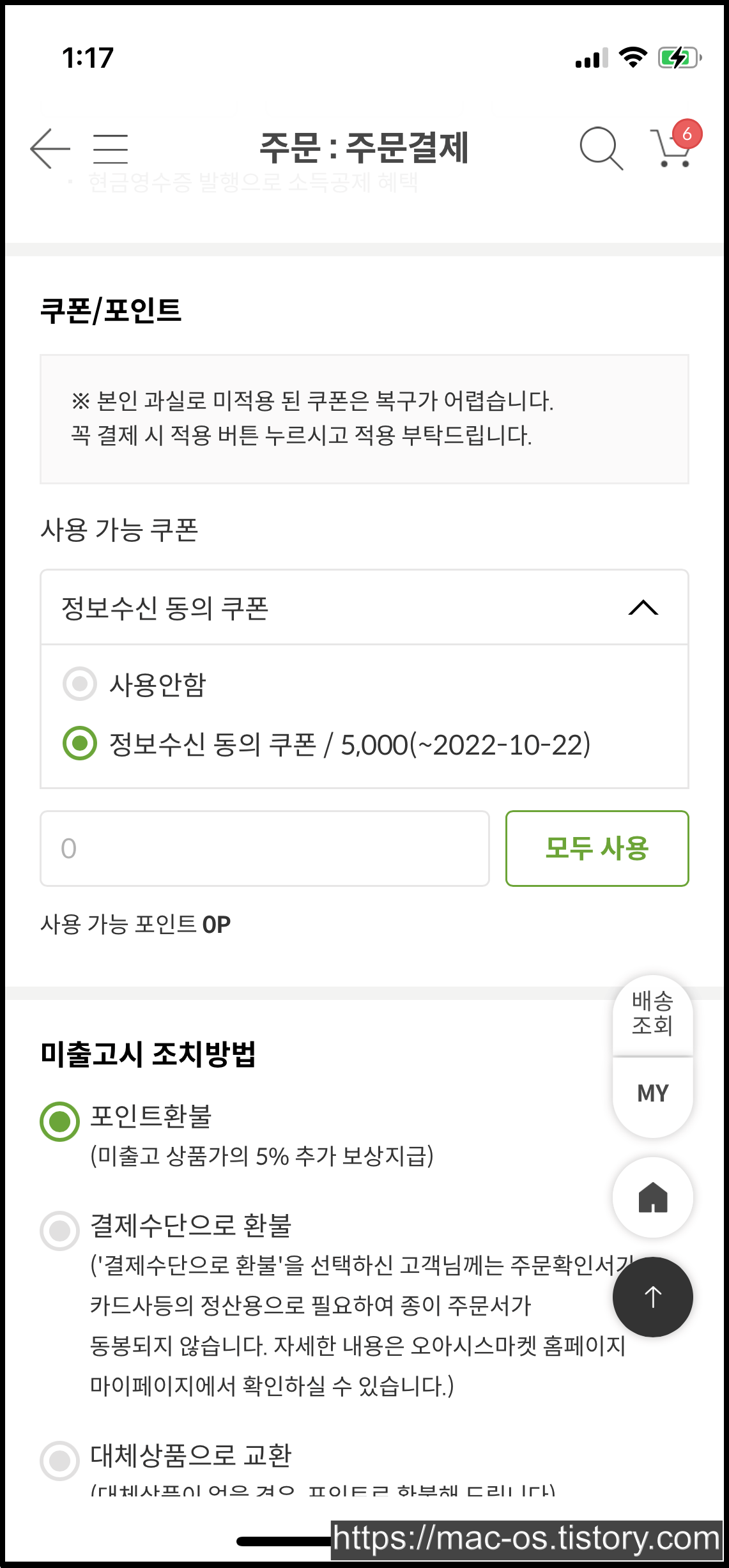 아까 문자 수신 동의로 바꿔서 받은 5천원 쿠폰도 적용시켜주고