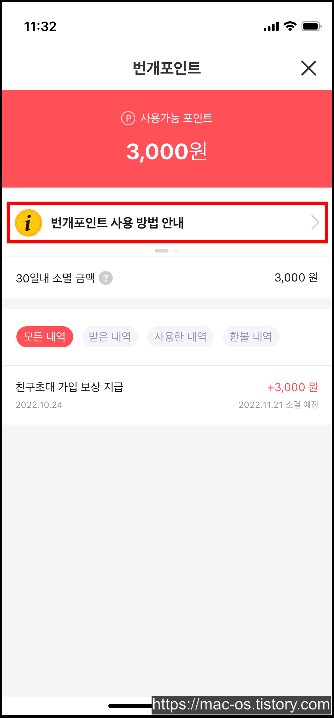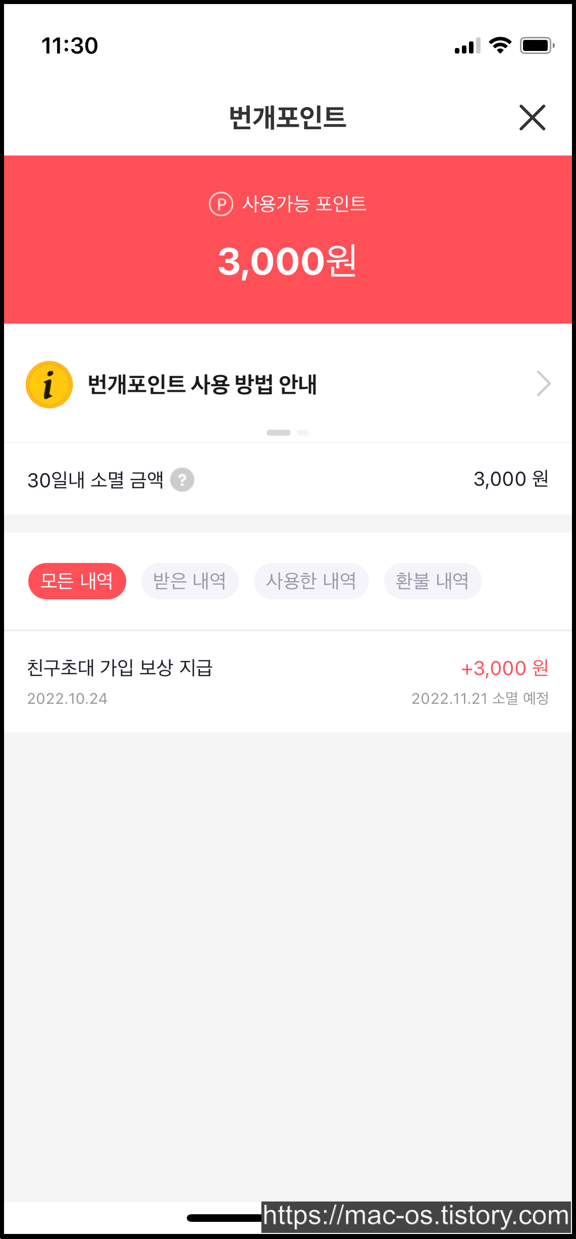 회원가입을 마치고 [MY]로 이동해보면 번개포인트 3,000원이 들어온 것을 확인할 수 있는데요. 만약 초대링크를 통해 앱을 설치하지 않았다면 0원으로 시작했을 겁니다.
