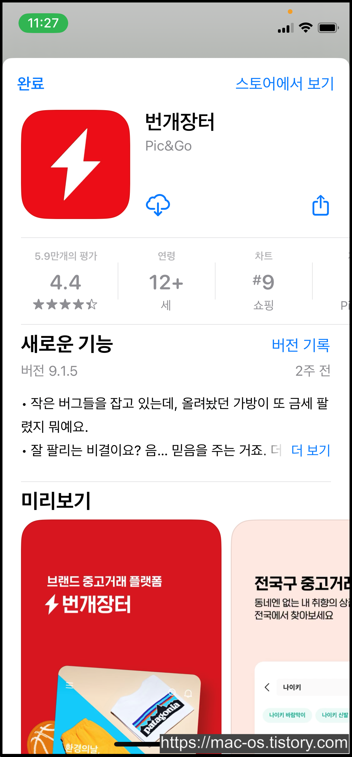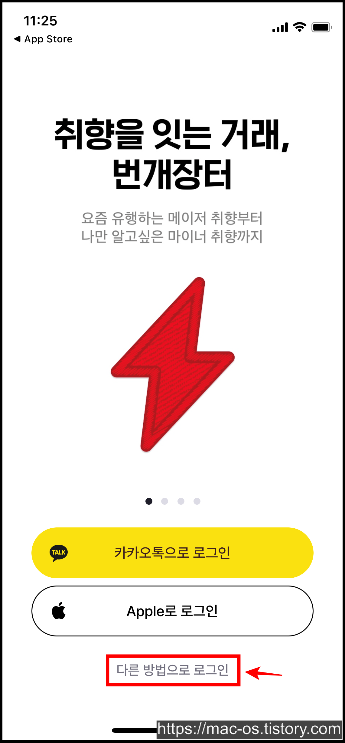 번개장터 초대링크를 클릭하면 앱스토어로 이동하게 됩니다. 여기서 번개장터 앱을 설치하고 로그인을 진행해주세요. 저는 본인 인증으로 시작하겠습니다.