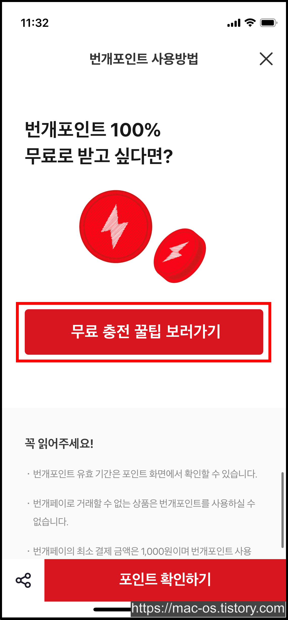 번개포인트 사용방법 페이지에서 아래로 스크롤을 내린 뒤, [무료 충전 꿀팁 보러가기]로 이동합니다.
