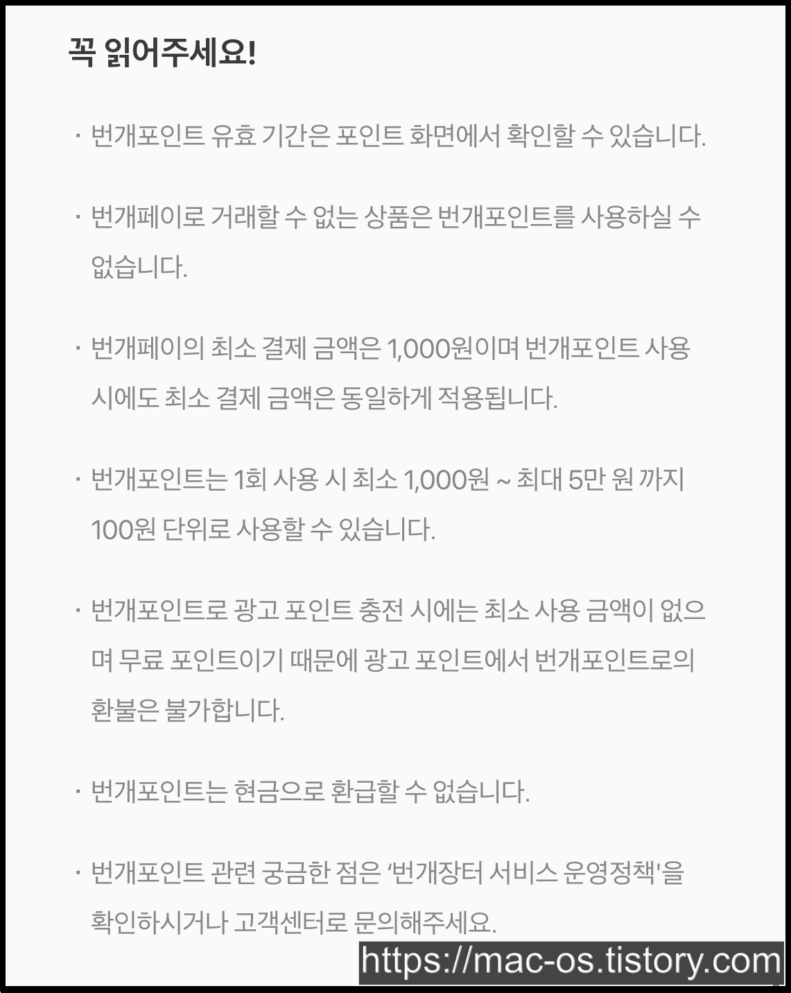 번개포인트 유효기간은 포인트 화면에서 확인할 수 있으며, 번개페이로 거래할 수 없는 상품은 번개포인트를 사용할 수 없습니다. 그밖에 주의사항은 오른쪽 사진을 한 번 참고해주세요.