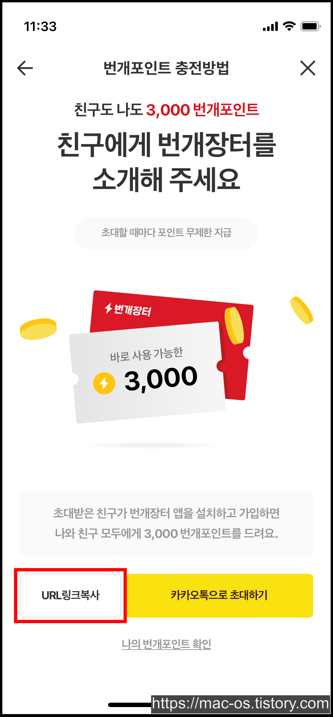 친구가 초대받은 링크로 가입하면 친구도 나도 3,000원의 번개포인트가 지급됩니다. 횟수 제한 없이 초대할 때마다 번개포인트를 계속 얻을 수 있다고 하네요.