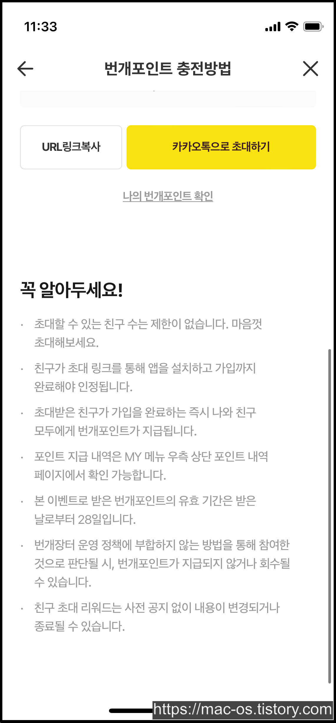 번개포인트 친구초대 페이지에서 URL링크를 복사하거나 카카오톡으로 초대할 수 있습니다.
