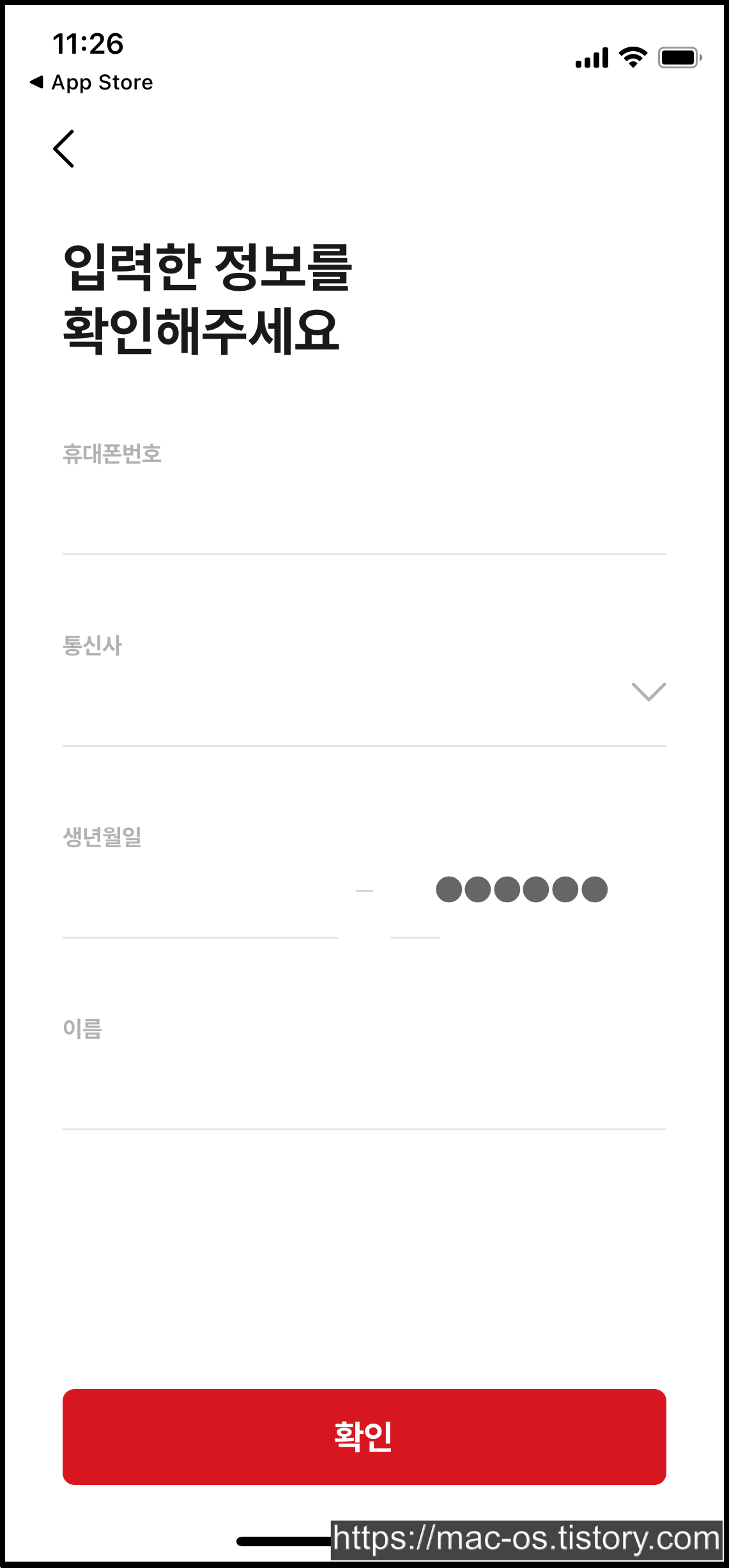 본인 인증으로 시작하게 되면 이름과 생년월일, 통신사, 휴대폰 번호를 입력하고 인증번호를 입력하게 됩니다.