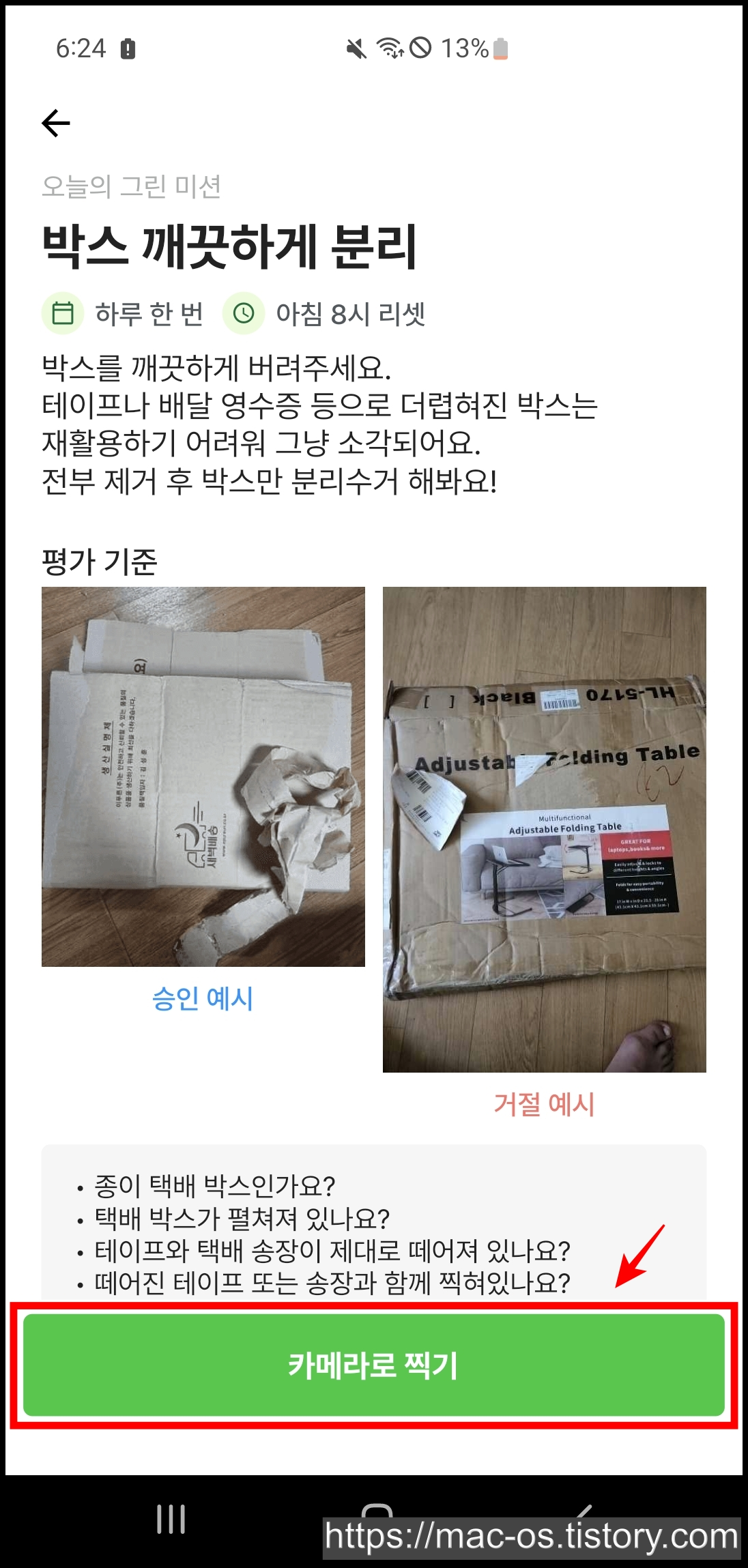 '오늘의 그린 미션'에서는 장바구니 사용하기, 우유팩 분리수거와 같은 미션을 수행하고 카메라로 사진을 찍어 제출하면 된다. 이런 미션을 모두 수행하면 하루에 100P를 얻을 수 있다.