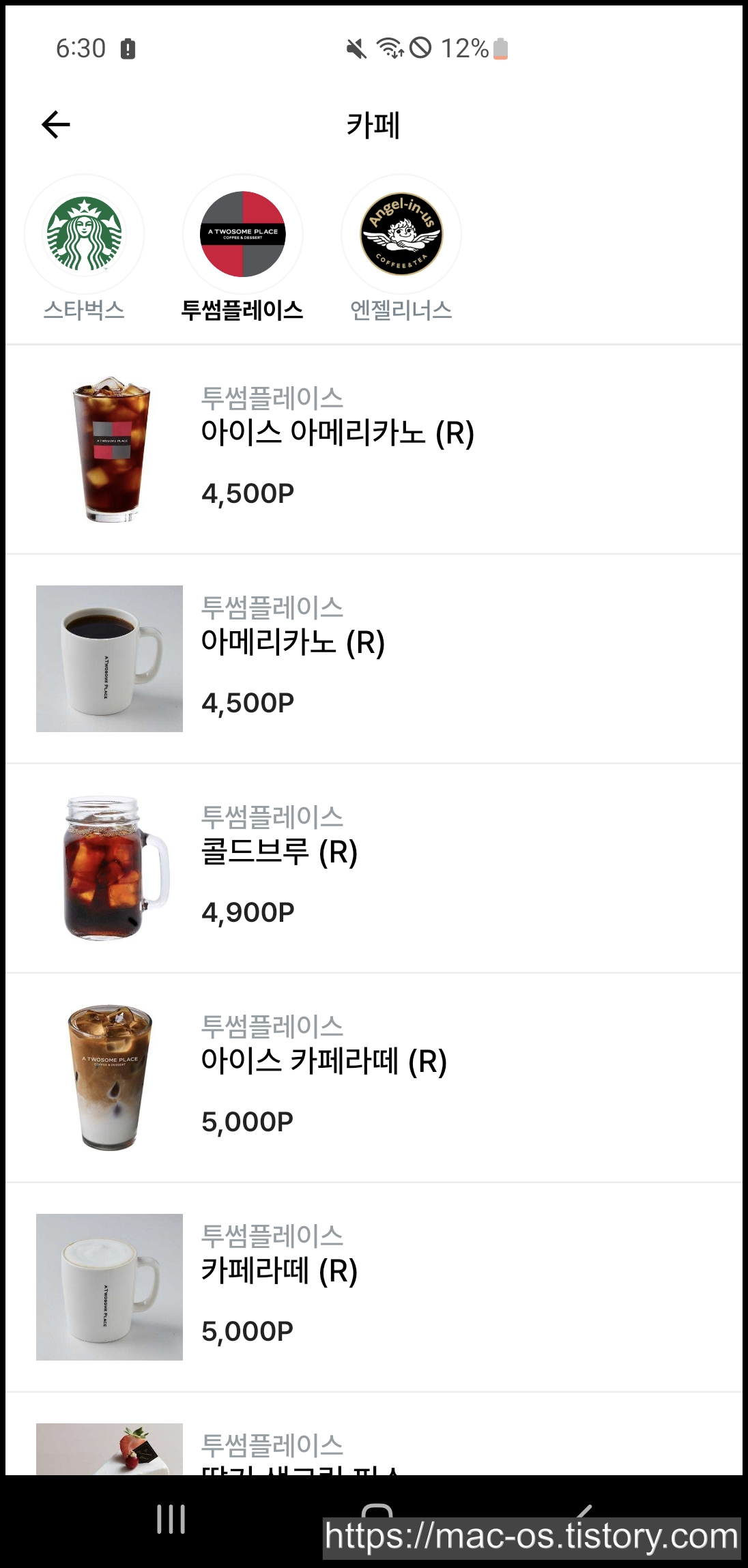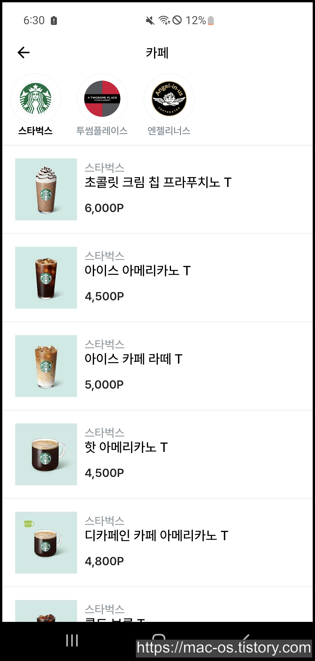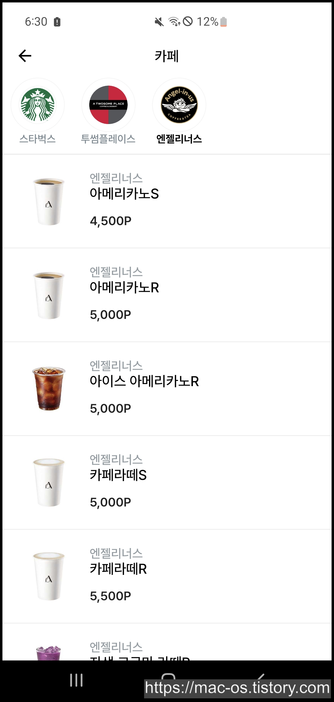 포인트는 카페, 외식, 후원하기에 사용할 수 있는데 카페는 스타벅스, 투썸플레이스, 엔젤리너스 총 3개의 제휴처에서 사용이 가능하다.