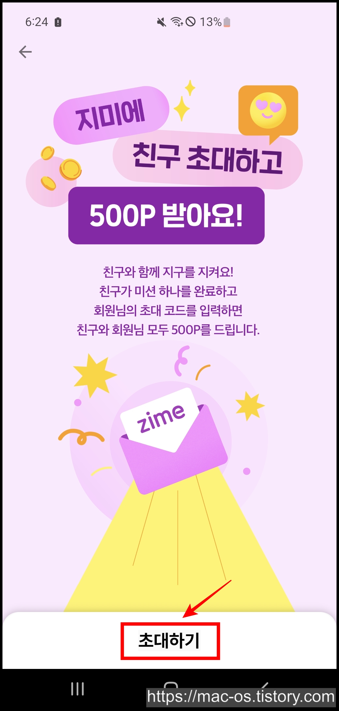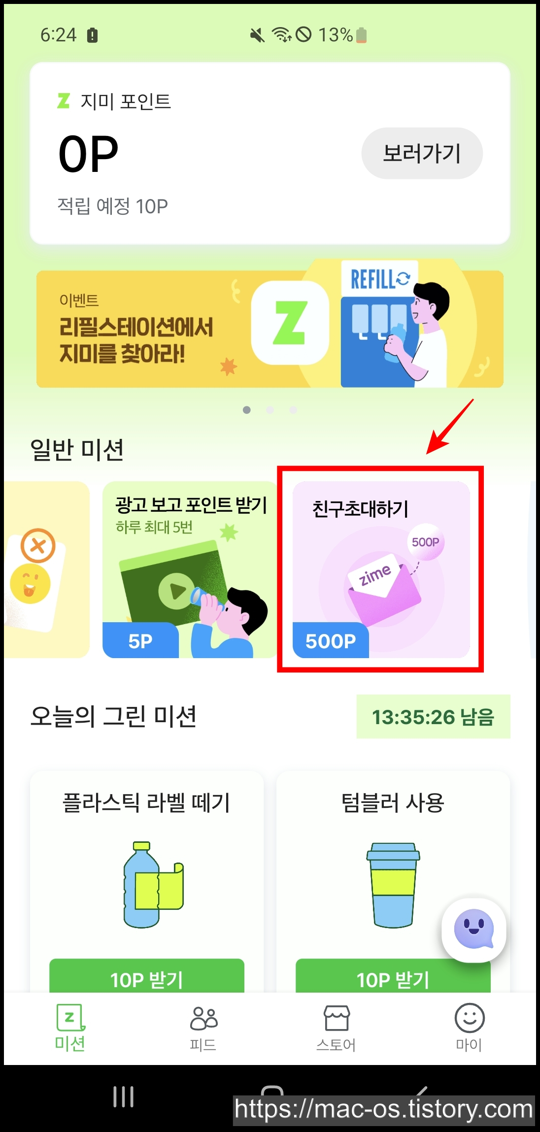 홈 화면에서 [일반 미션]을 슬라이드하면 구석에 [친구초대하기] 배너가 있는데 여기를 클릭해주자.