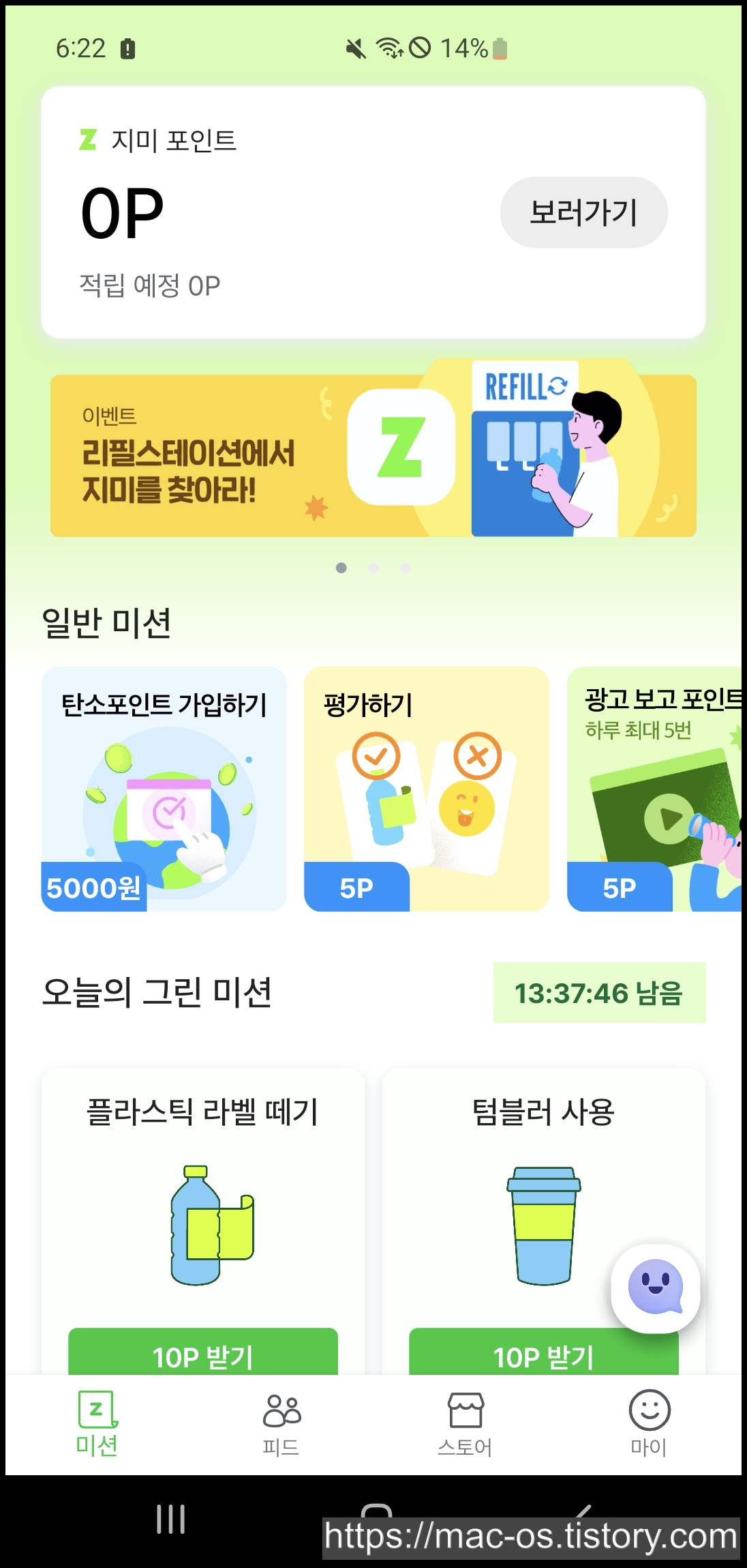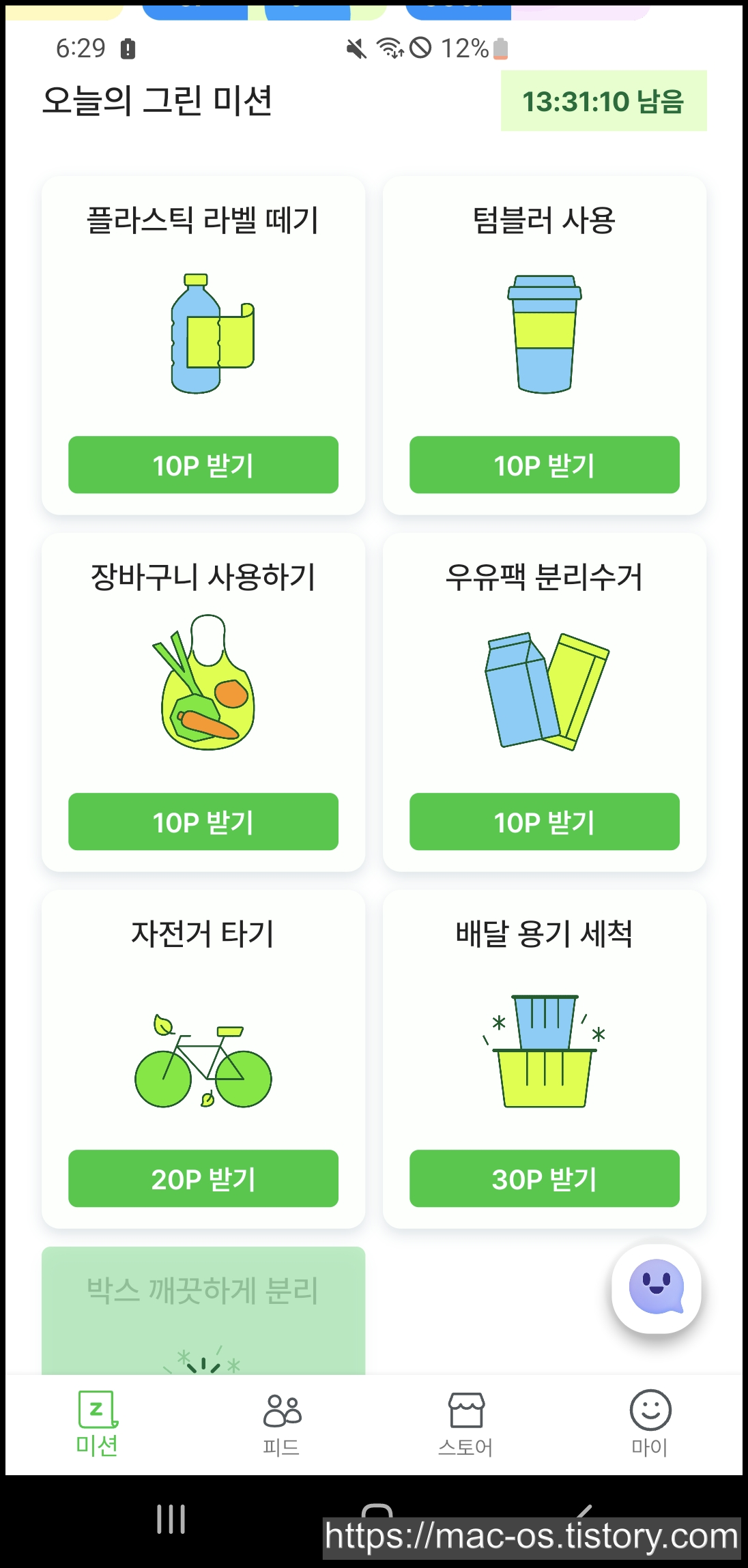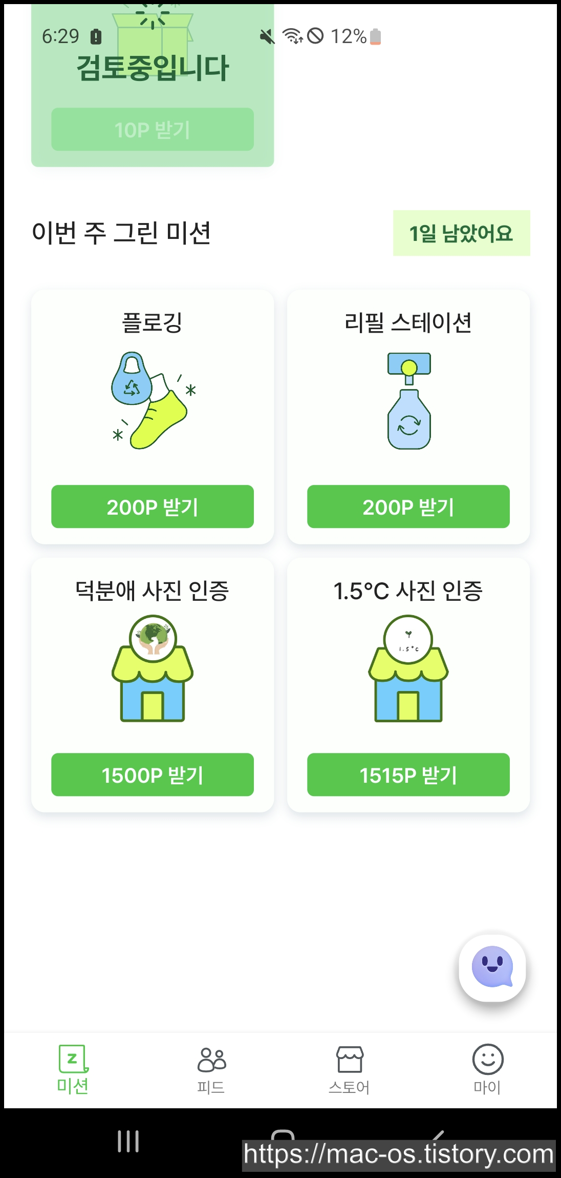 '이번 주 그린 미션'에서는 '플로깅'이나 '리필 스테이션'과 같은 미션이 있는데, 친환경 제품들을 주로 판매하는 가게를 방문해 인증샷을 찍으면 200~1,500P 정도를 주는 형태로 구성되어 있다.