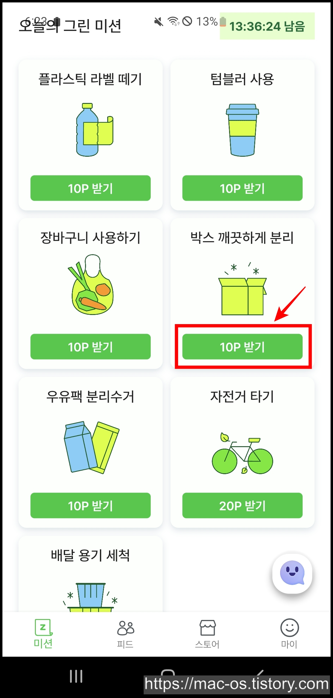 오늘의 그린 미션에는 총 9개의 미션으로 구성되어 있다. 플라스틱 라벨을 떼거나 텀블러를 사용하는 등 환경에 도움을 주고 포인트를 얻는다는 취지가 매우 마음에 든다.
