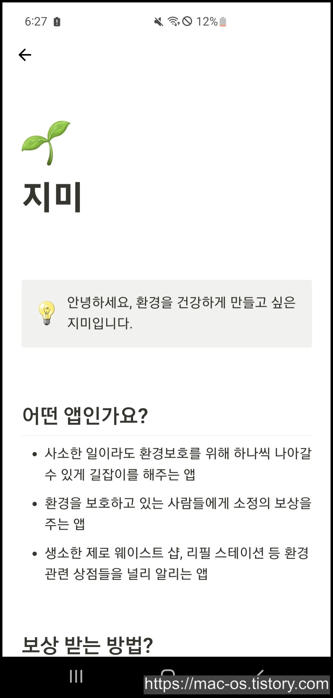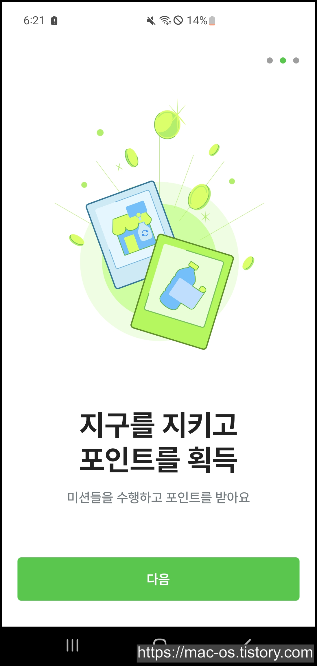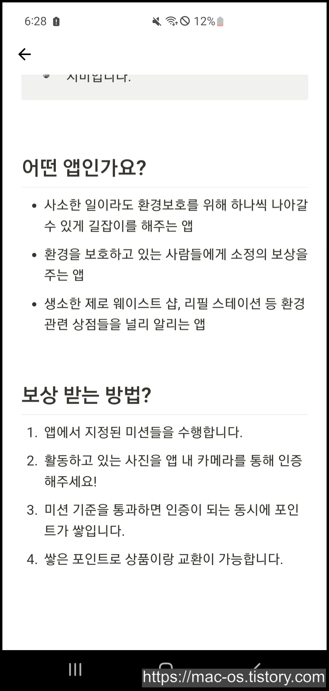 - 앱 특징 : 환경에 도움을 주는 미션을 수행하고 보상으로 포인트를 받아 기프티콘으로 교환할 수 있는 어플이다.