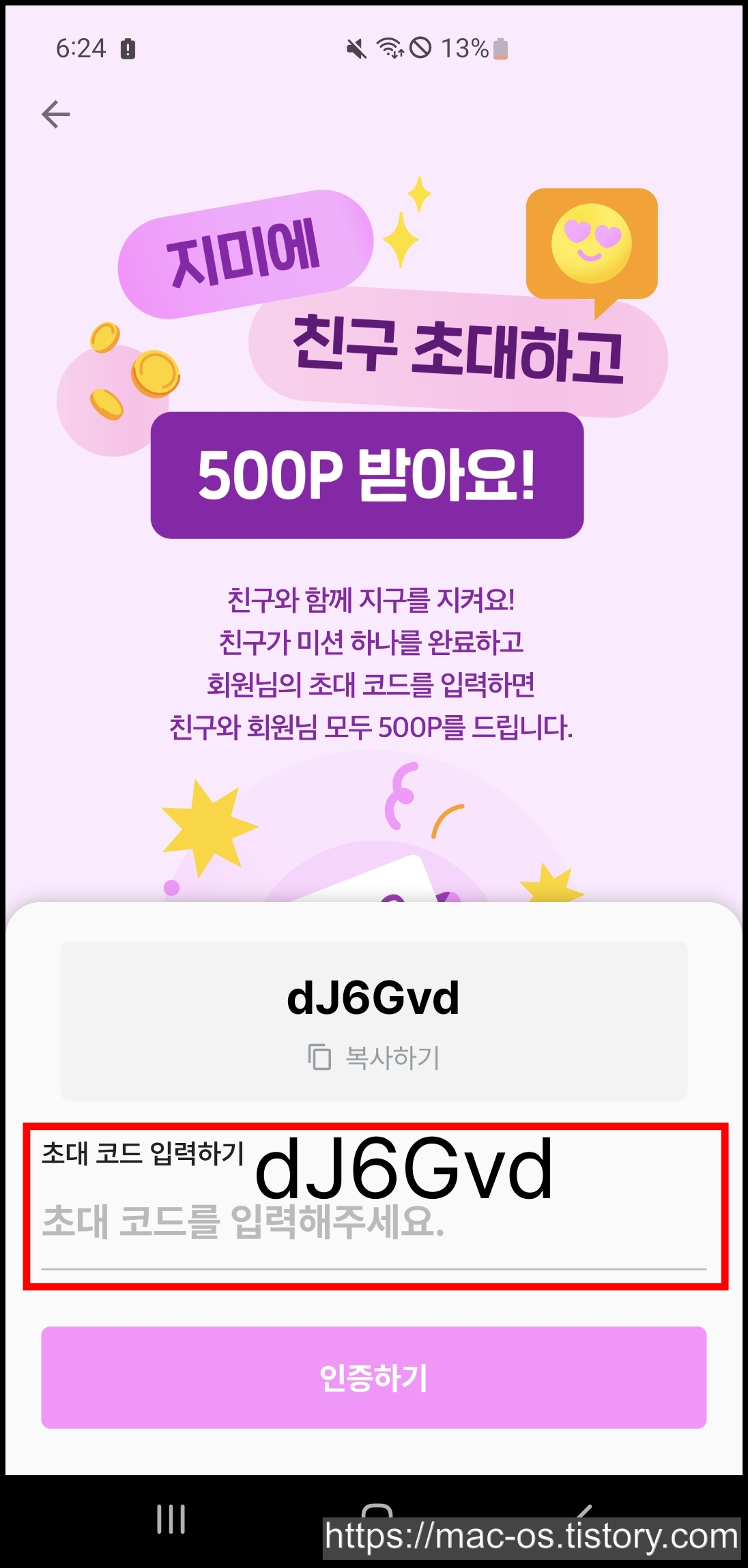[초대하기]를 터치하면 초대코드를 입력하거나 자신의 초대코드를 복사할 수 있다. 초대코드를 입력하면 입력한 사람과 초대한 사람 모두에게 500포인트가 지급된다.