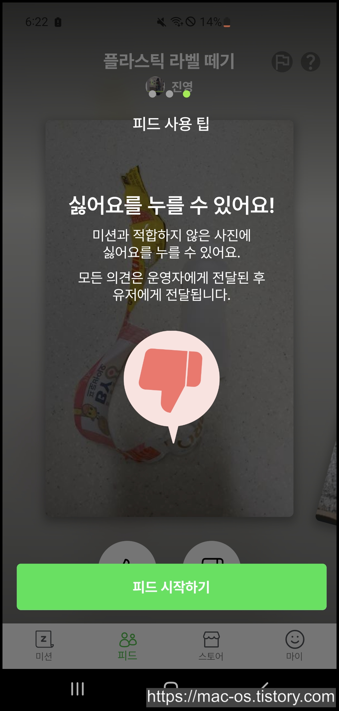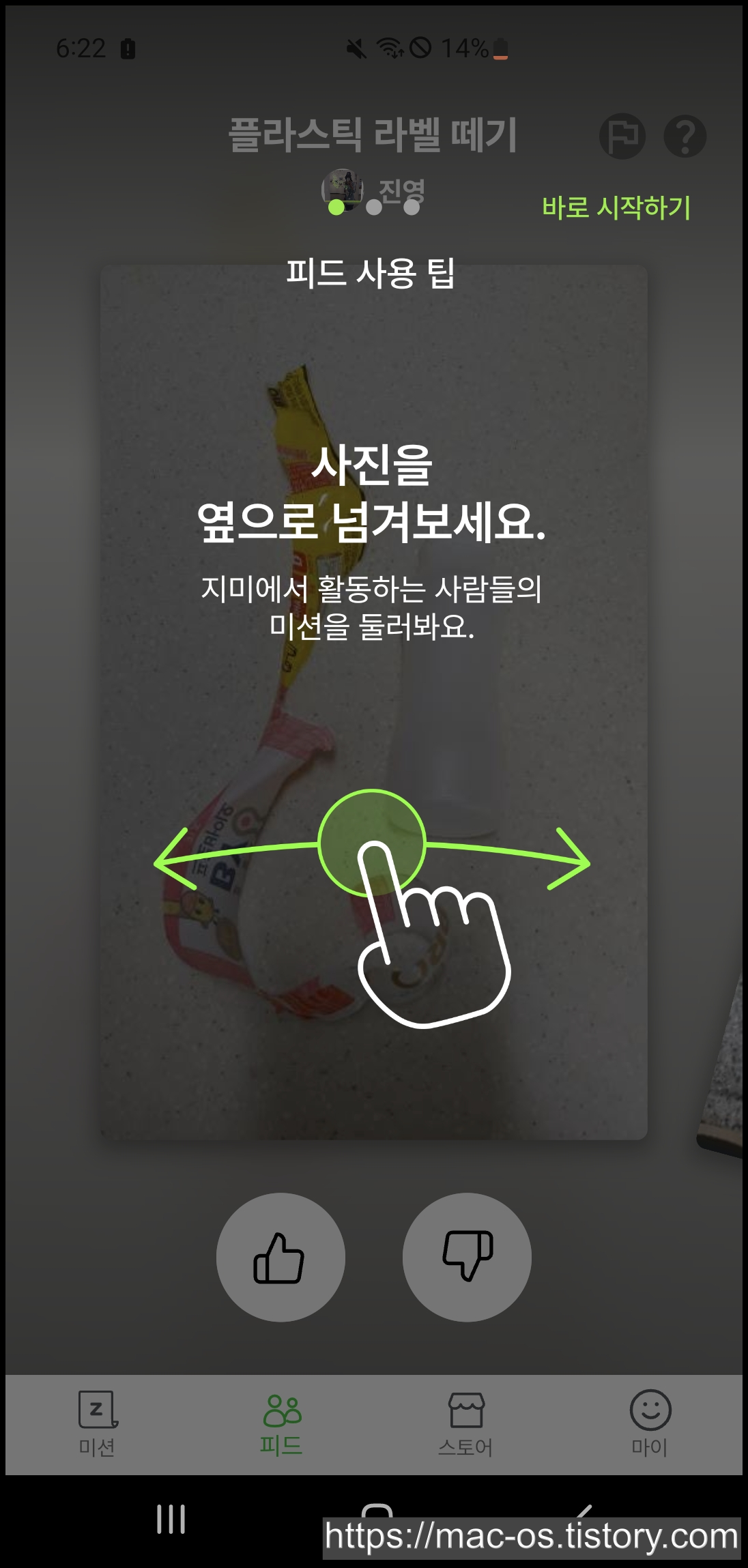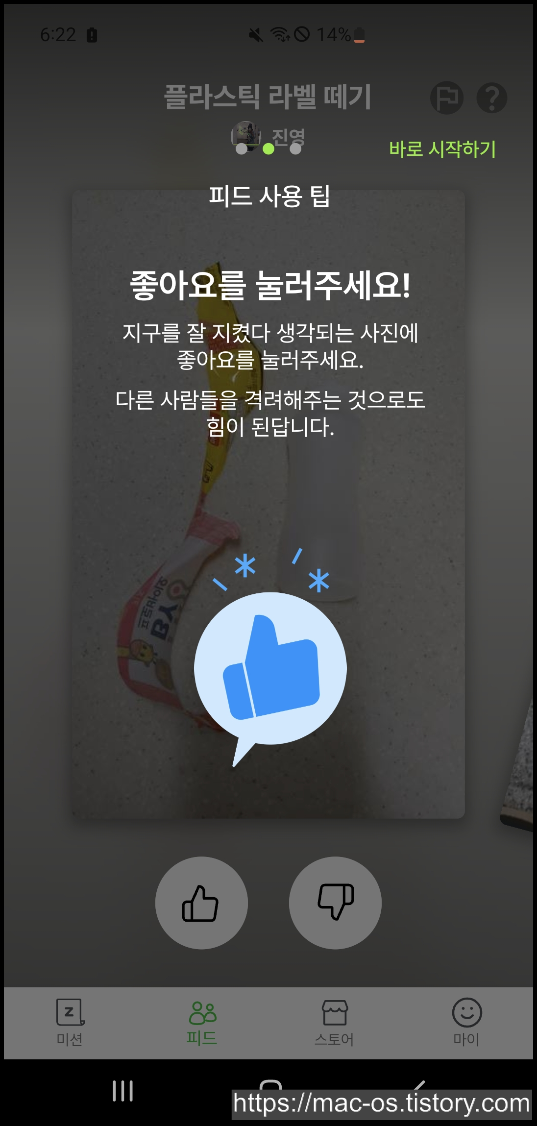 [피드] 탭에서는 다른 사람의 미션 인증샷을 보고 좋아요를 누를 수 있게 되어있다.