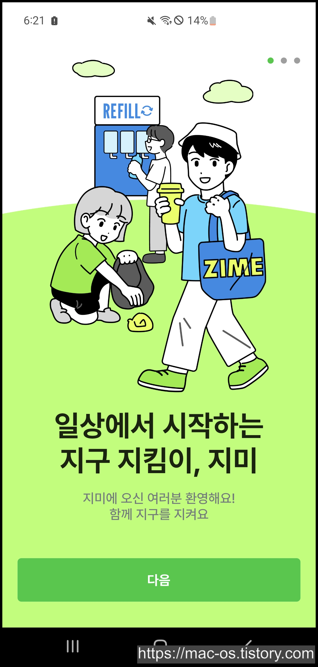 지미는 구글 플레이 스토어랑 앱스토어에서 설치할 수 있다. 앱을 처음 실행하면 이렇게 슬라이드 이미지 3장이 뜬다.