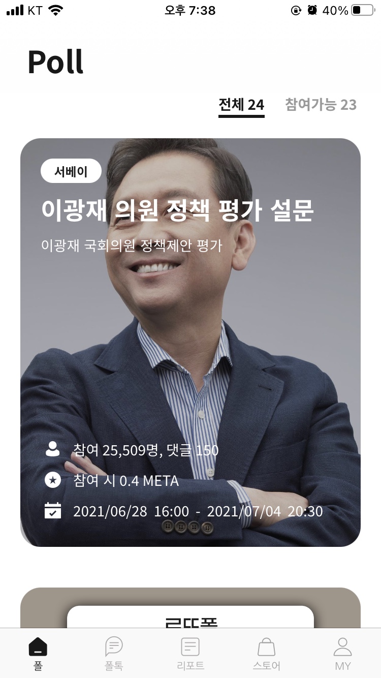 마음에 드시는 폴을 선택하여 참여해보세요. 위의 초대링크를 통해 여기까지 따라오신 분의 경우, 진행중인 폴 1개를 참여 완료하시면 500원 상당의 META가 추가로 지급됩니다.