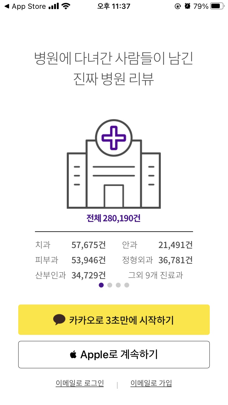 모두닥을 실행하시면 카카오/Apple/이메일 3가지 방법으로 가입하실 수 있습니다. Google Play Store에서 모두닥을 설치하셨다면 Google 계정으로 가입하실 수도 있습니다.