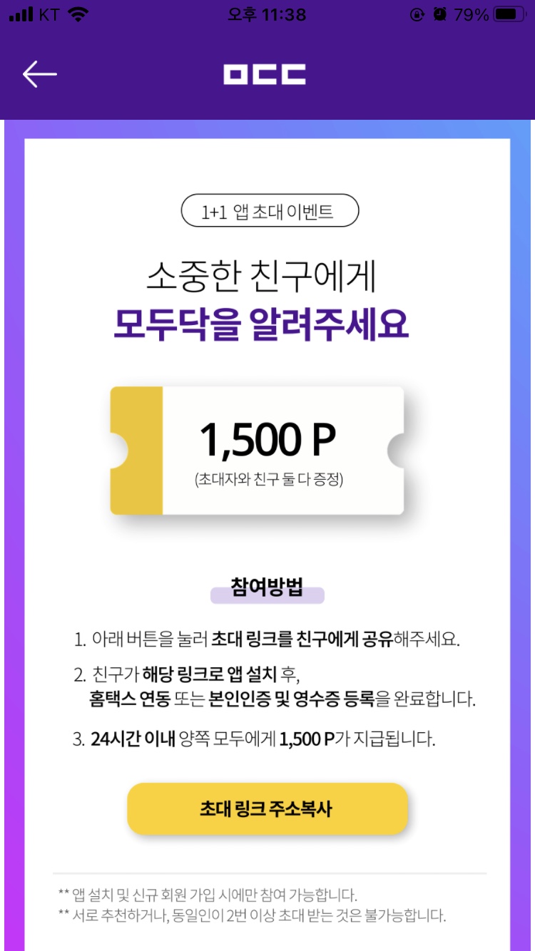 ※ 모두닥 친구초대 링크를 통해 가입하지 않는 경우, 0P로 시작하게 되어 1,500P를 받으실 수 없습니다. 꼭 초대링크를 통해 가입하세요!