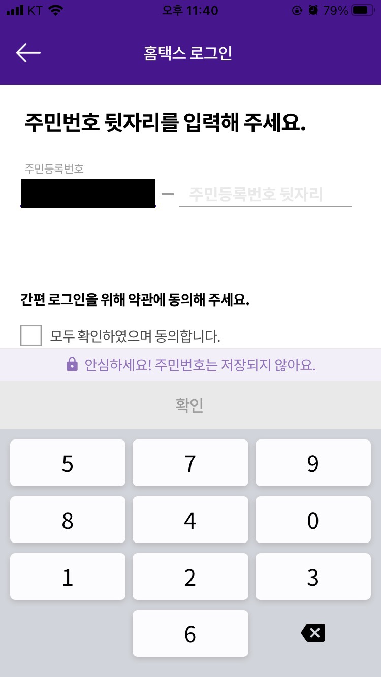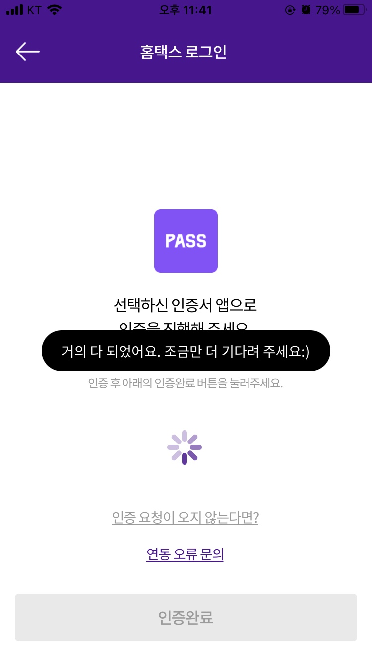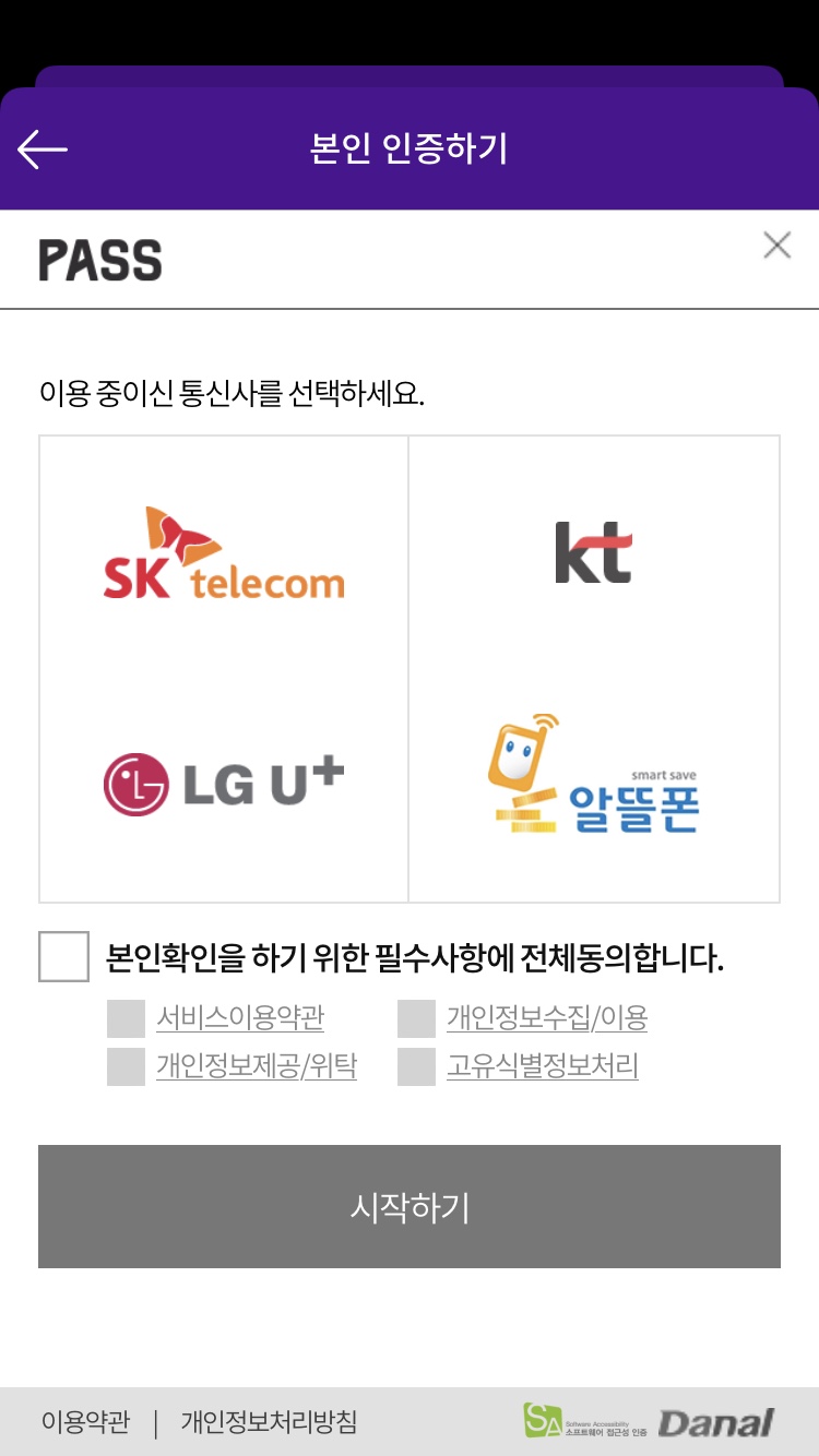저는 PASS 앱을 사용하였습니다. 로그인 방법을 선택하면 주민번호 뒷자리를 입력하게 됩니다. 입력하시고 PASS에서 인증 요청을 확인해주세요.