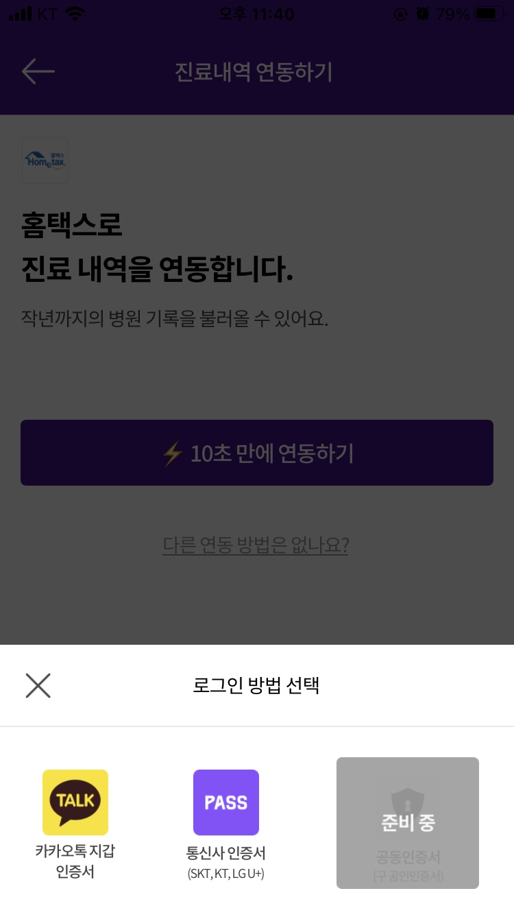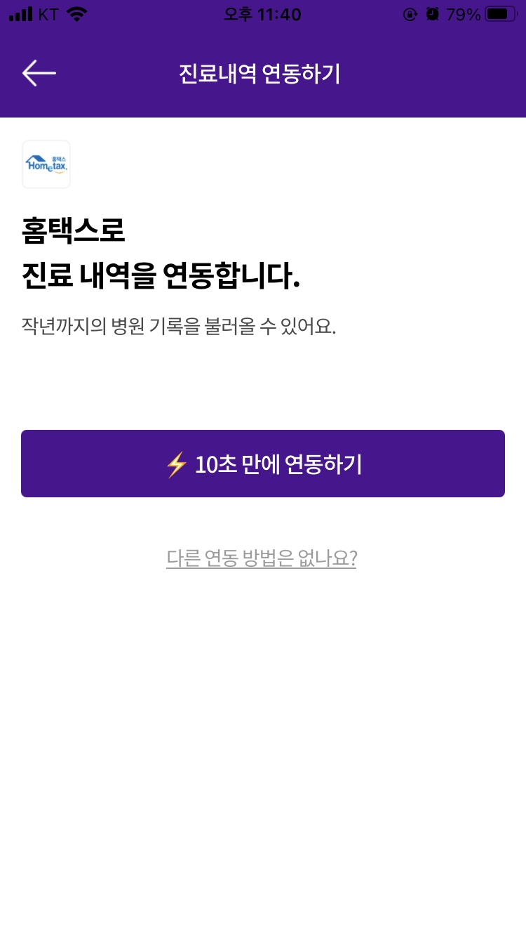 홈택스 연동을 위해선 휴대폰 본인 인증이 필요합니다. 휴대폰 본인 인증 후 아래의 '10초 만에 연동하기'를 터치해주세요.