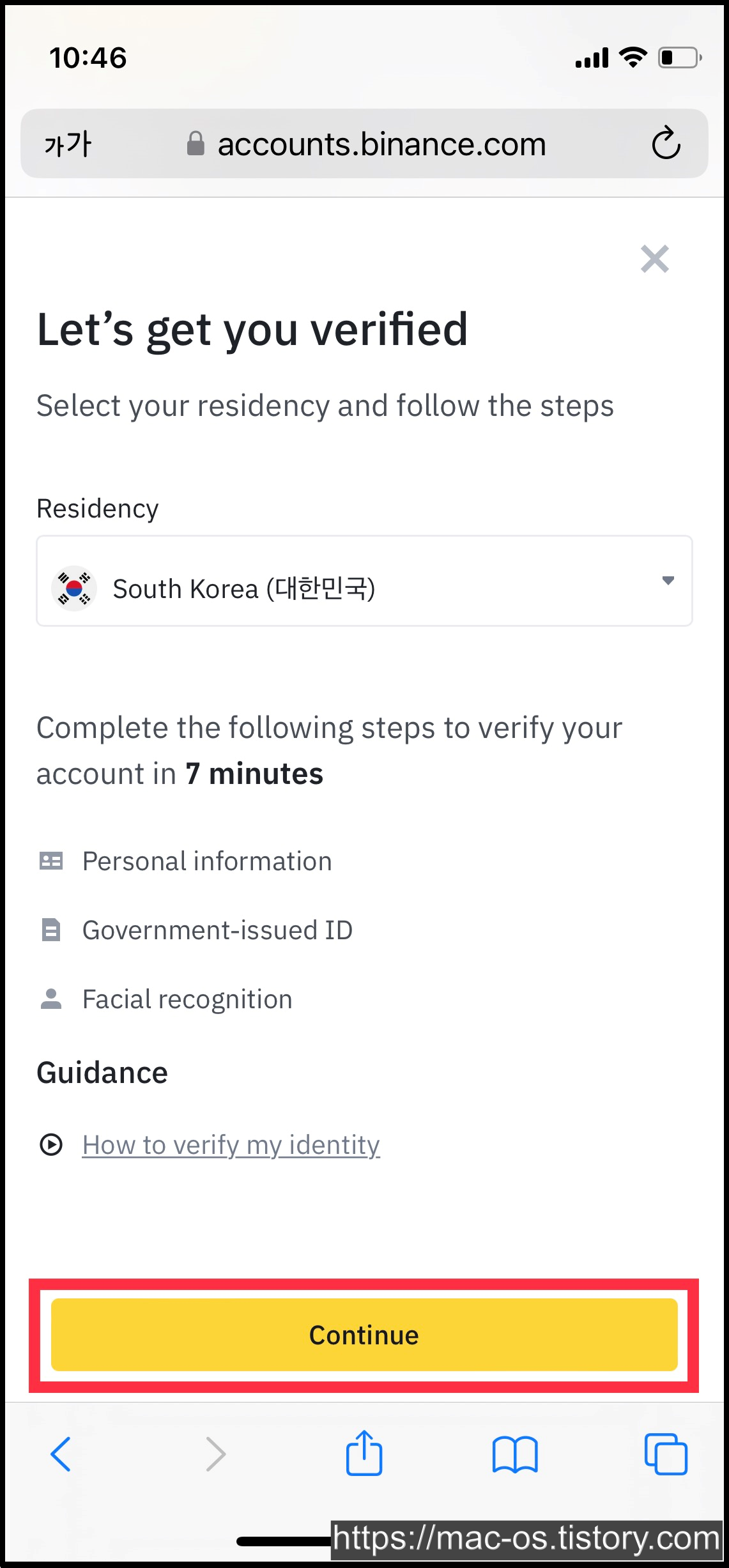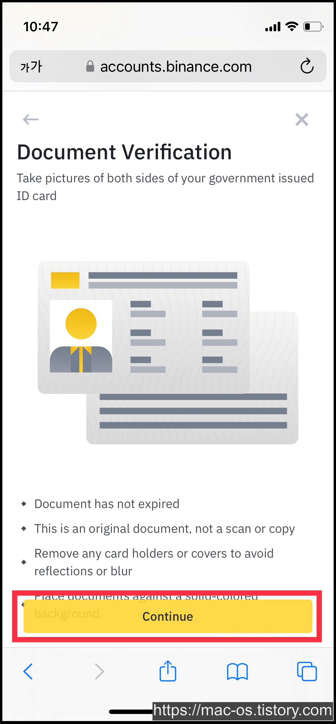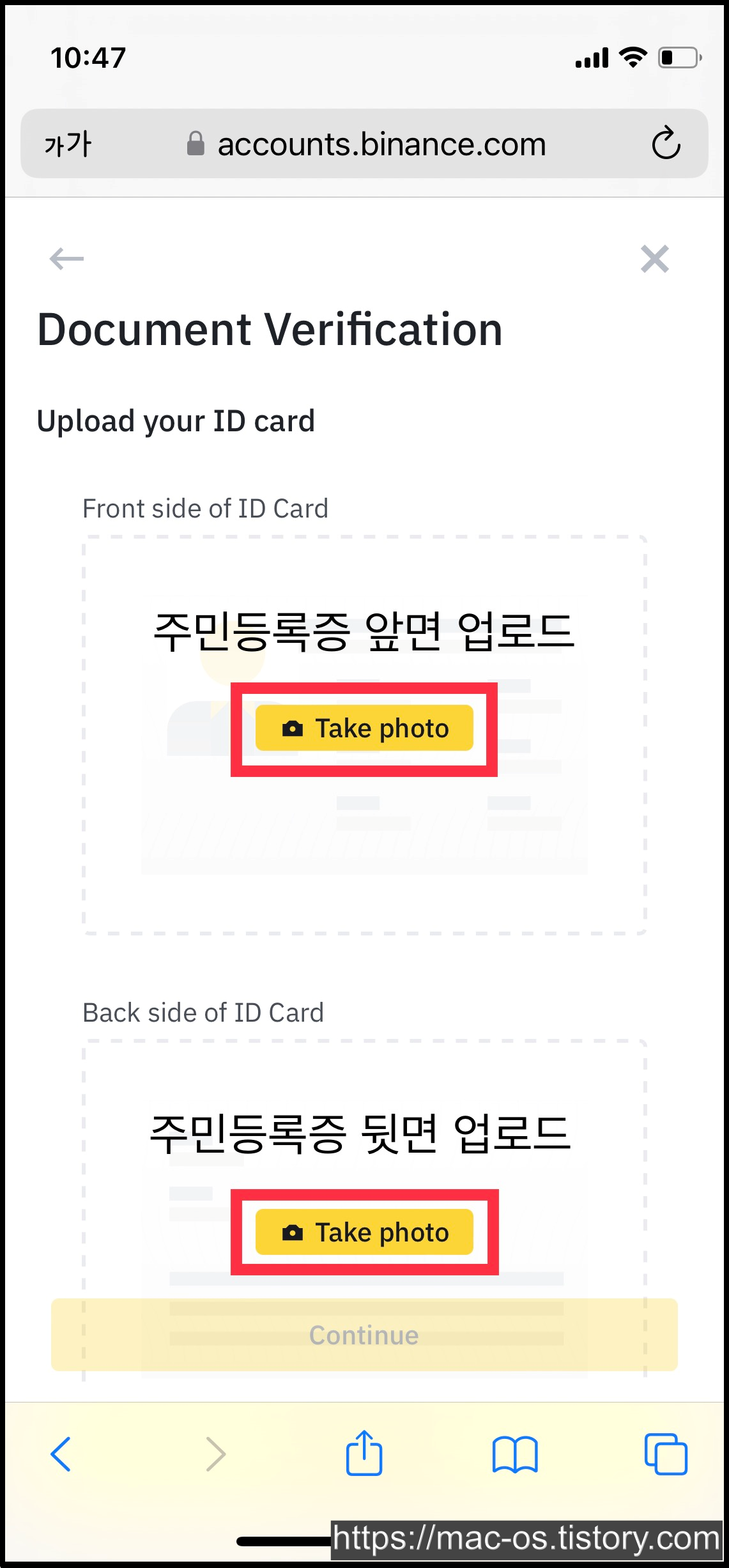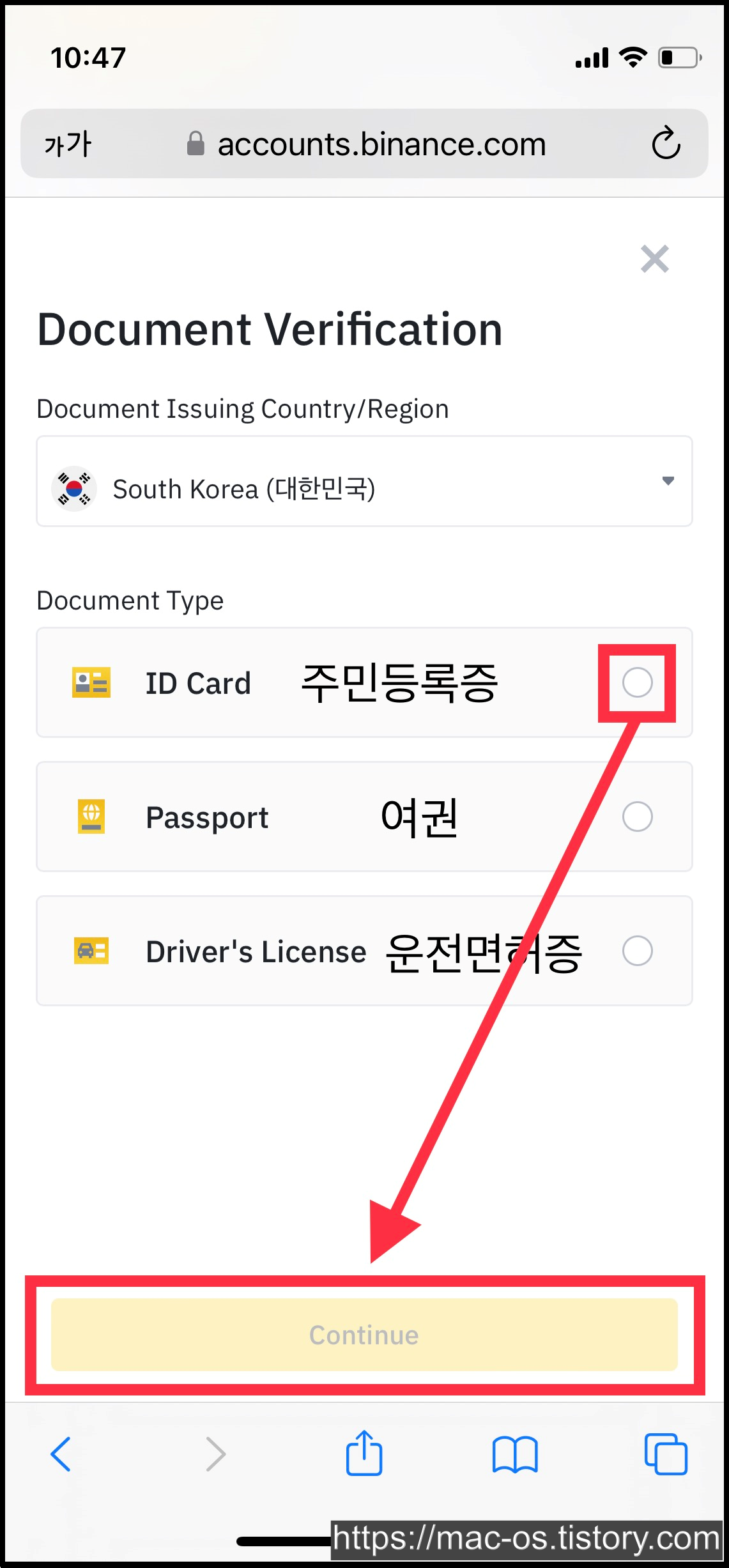 바이낸스를 가입하기 위해선 주민등록증이나 여권, 운전면허증 중에서 1개가 필요합니다. 원하는 방식을 선택하고 [Continue]를 계속 클릭합니다.