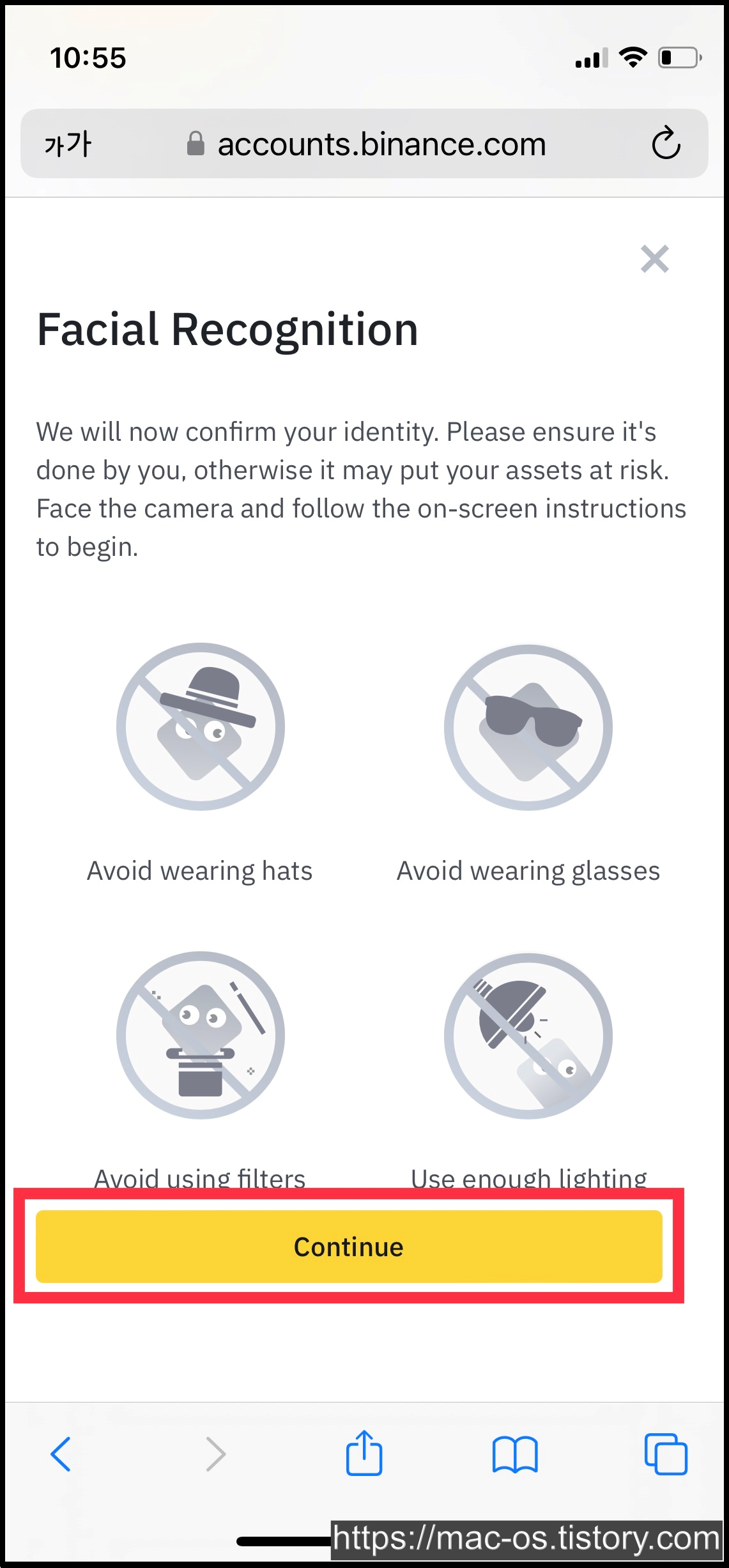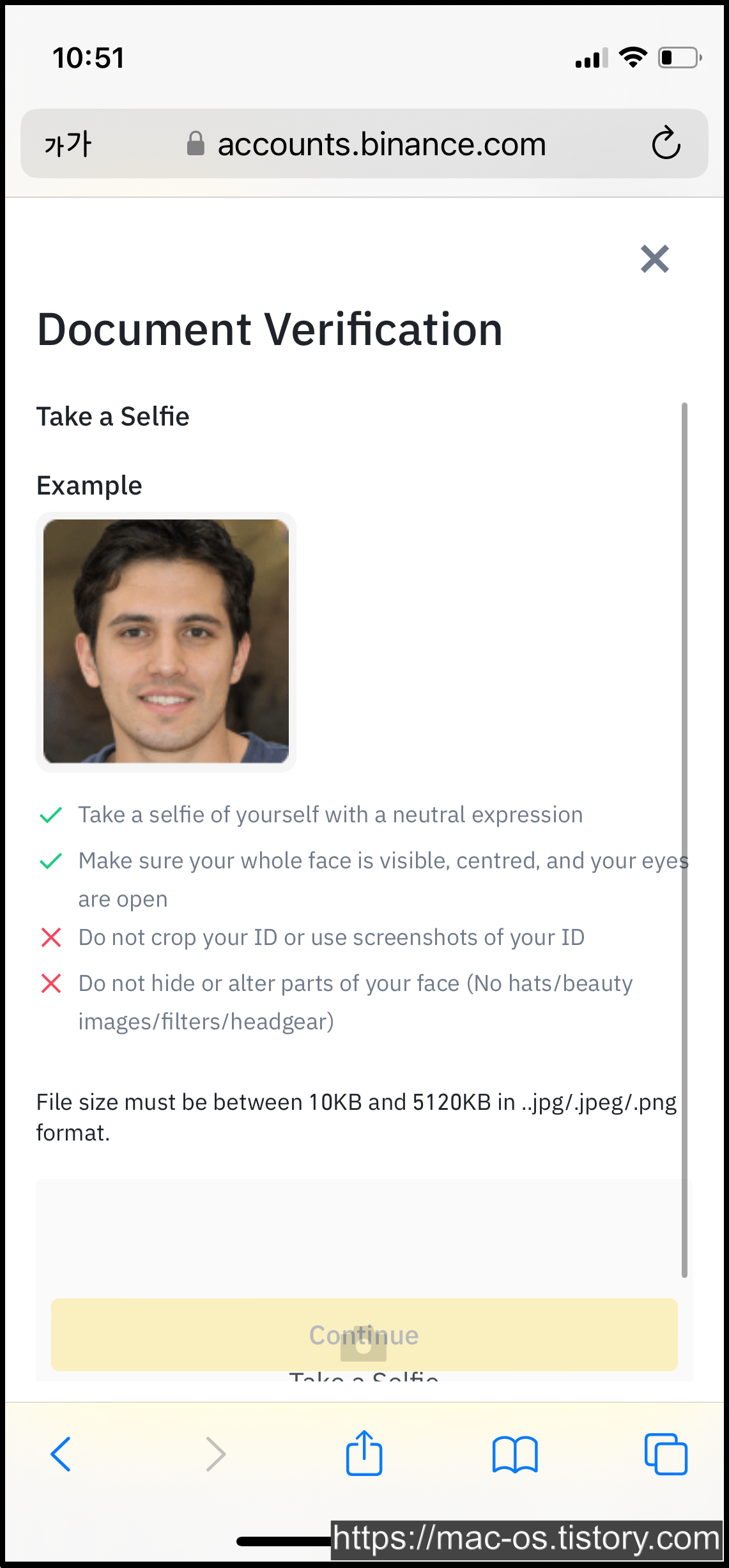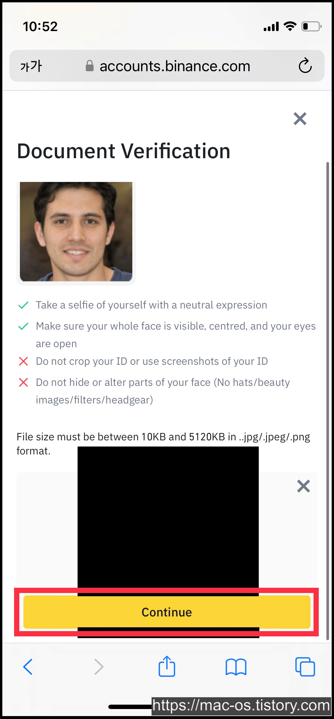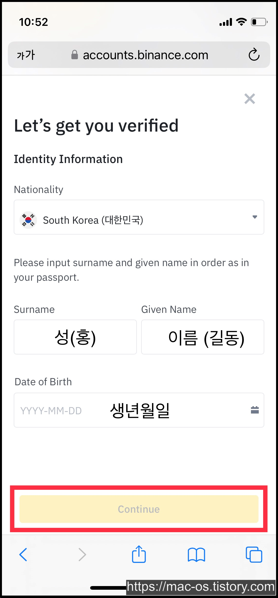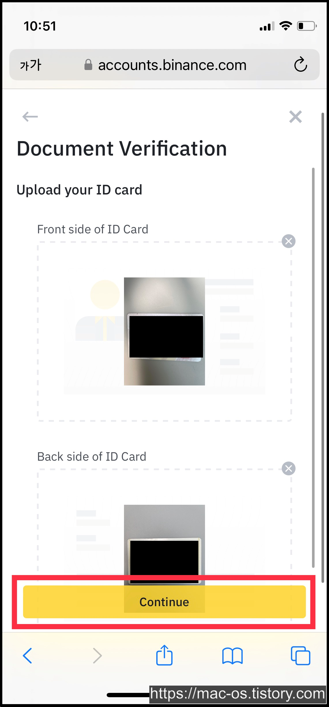바이낸스를 가입하기 위해선 주민등록증이나 여권, 운전면허증 중에서 1개가 필요합니다. 원하는 방식을 선택하고 [Continue]를 계속 클릭합니다.