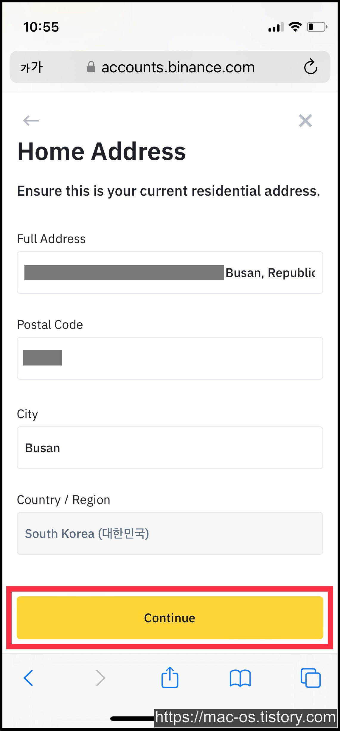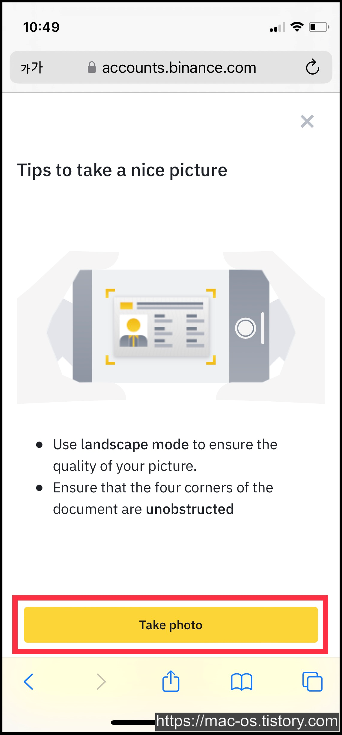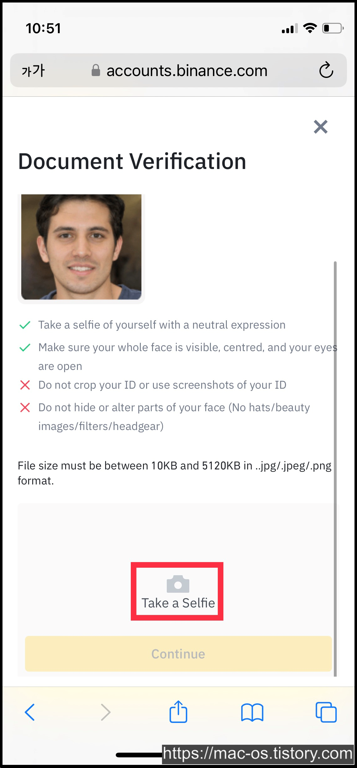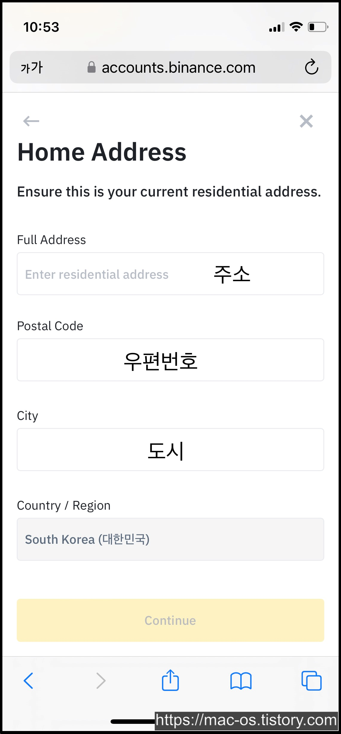 바이낸스를 가입하기 위해선 주민등록증이나 여권, 운전면허증 중에서 1개가 필요합니다. 원하는 방식을 선택하고 [Continue]를 계속 클릭합니다.