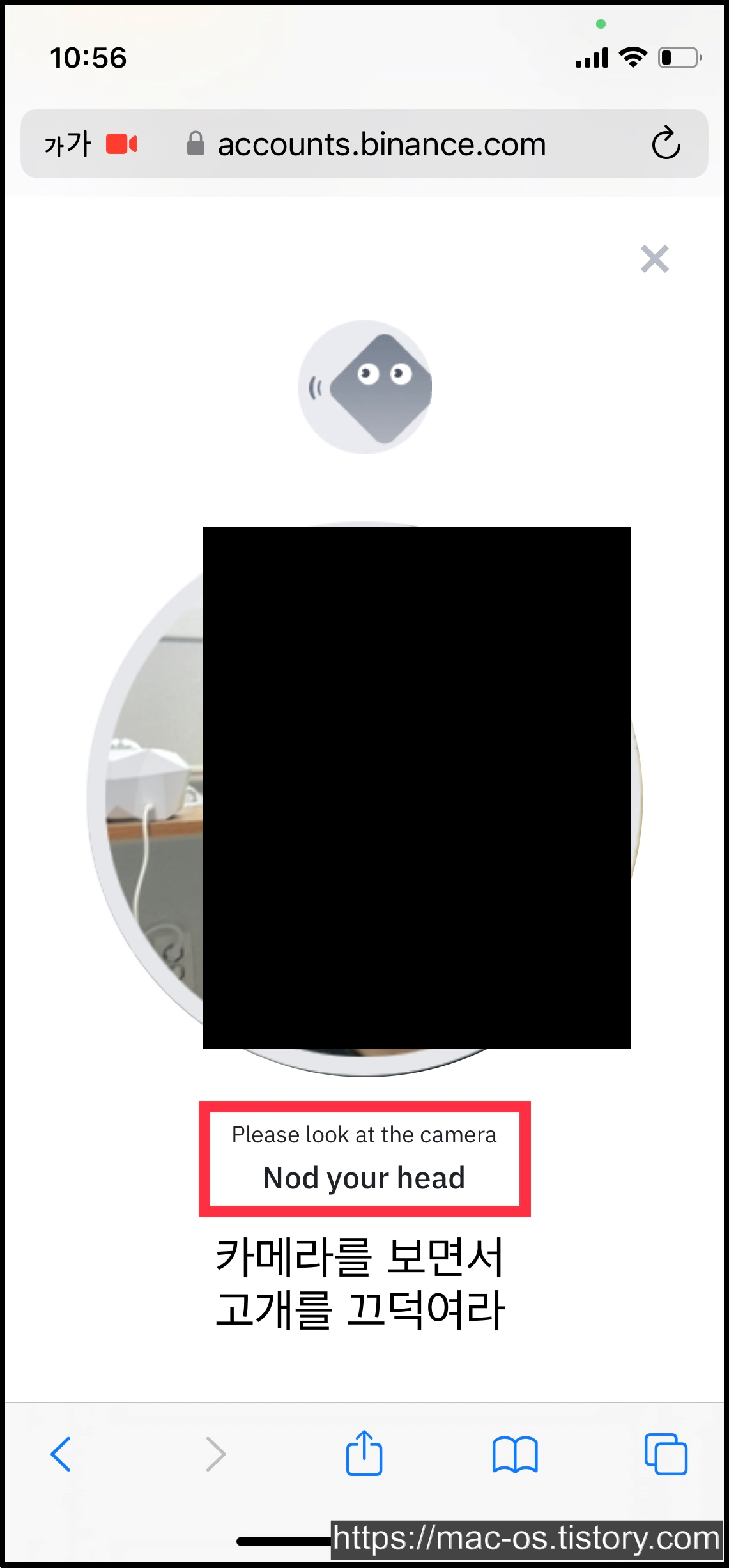 카메라 접근 권한을 허용해준 다음 Face 인식을 시작합니다. 이제 여기서 하단에 나타나는 문구를 보고 따라해주면 됩니다. Nod your head면 고개를 끄덕이라는 말이구요. 가끔 눈동자를 움직여보라고도 합니다.