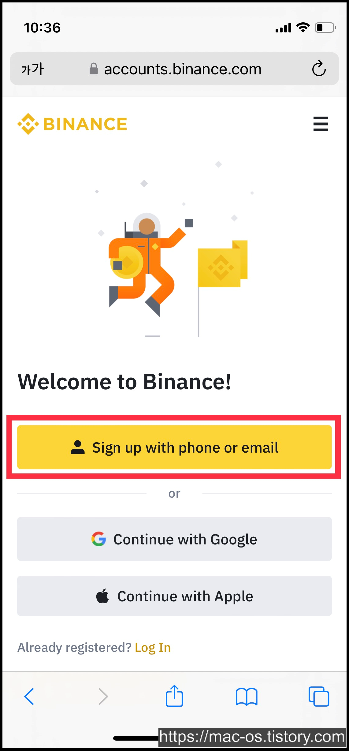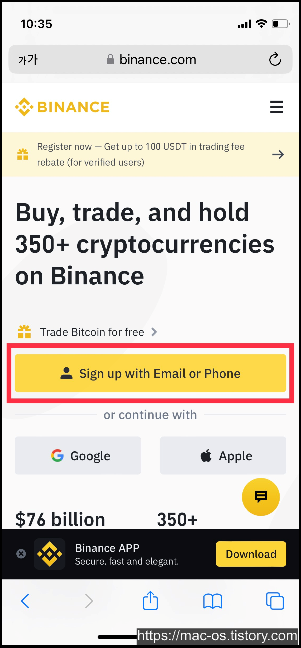 구글 검색창에서 바이낸스를 검색하거나 아래 주소를 클릭하여 이동합니다. 바이낸스 홈페이지에서 [Sign up with Email or Phone]을 터치해주세요.