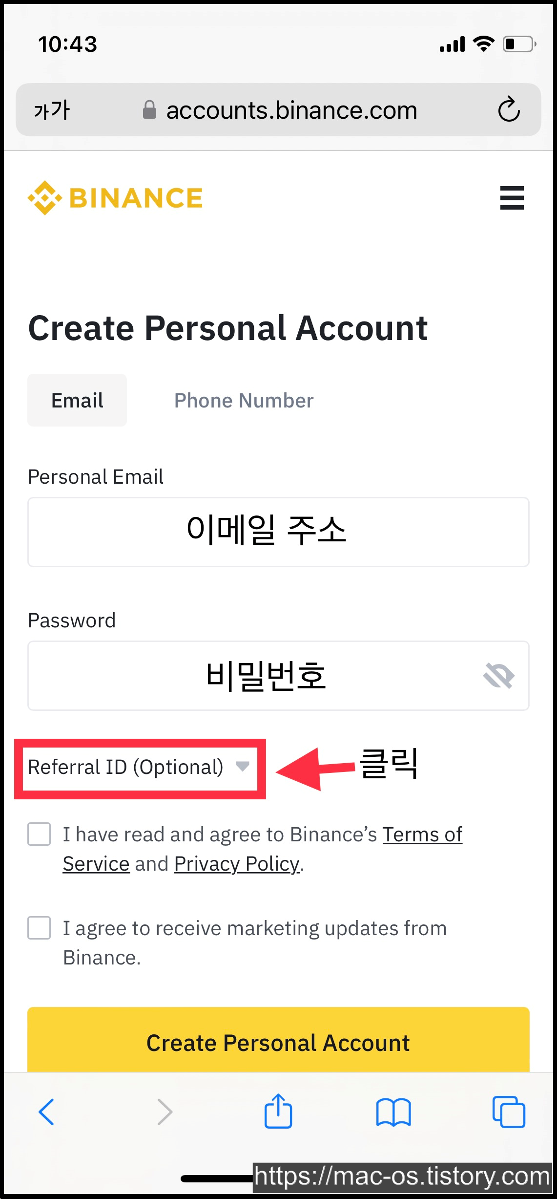 레퍼럴 아이디 입력 후 2개의 항목에 체크하고 [Create Personal Account]을 클릭합니다. 그리고 입력한 이메일로 발송된 인증번호 6자리를 확인해줍니다.