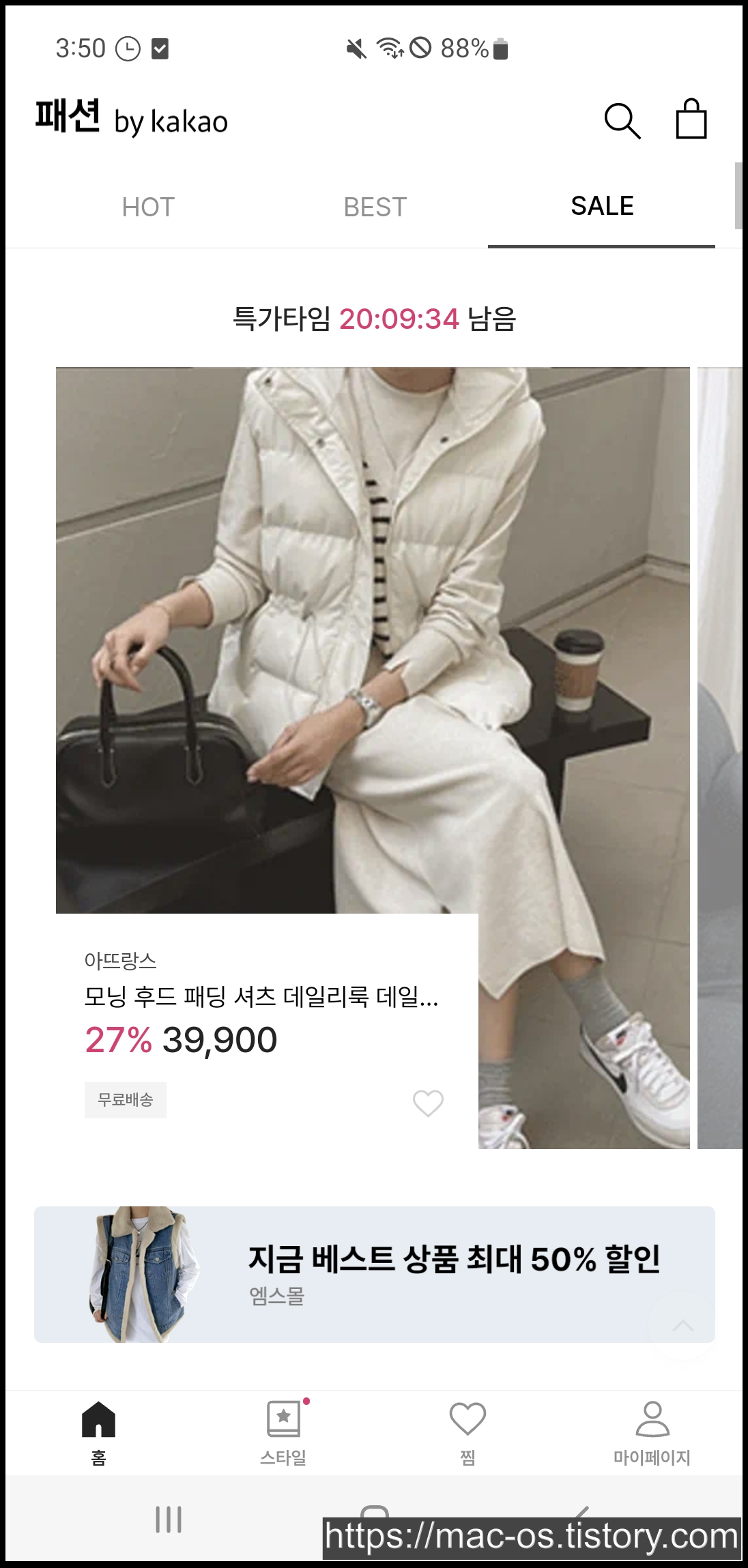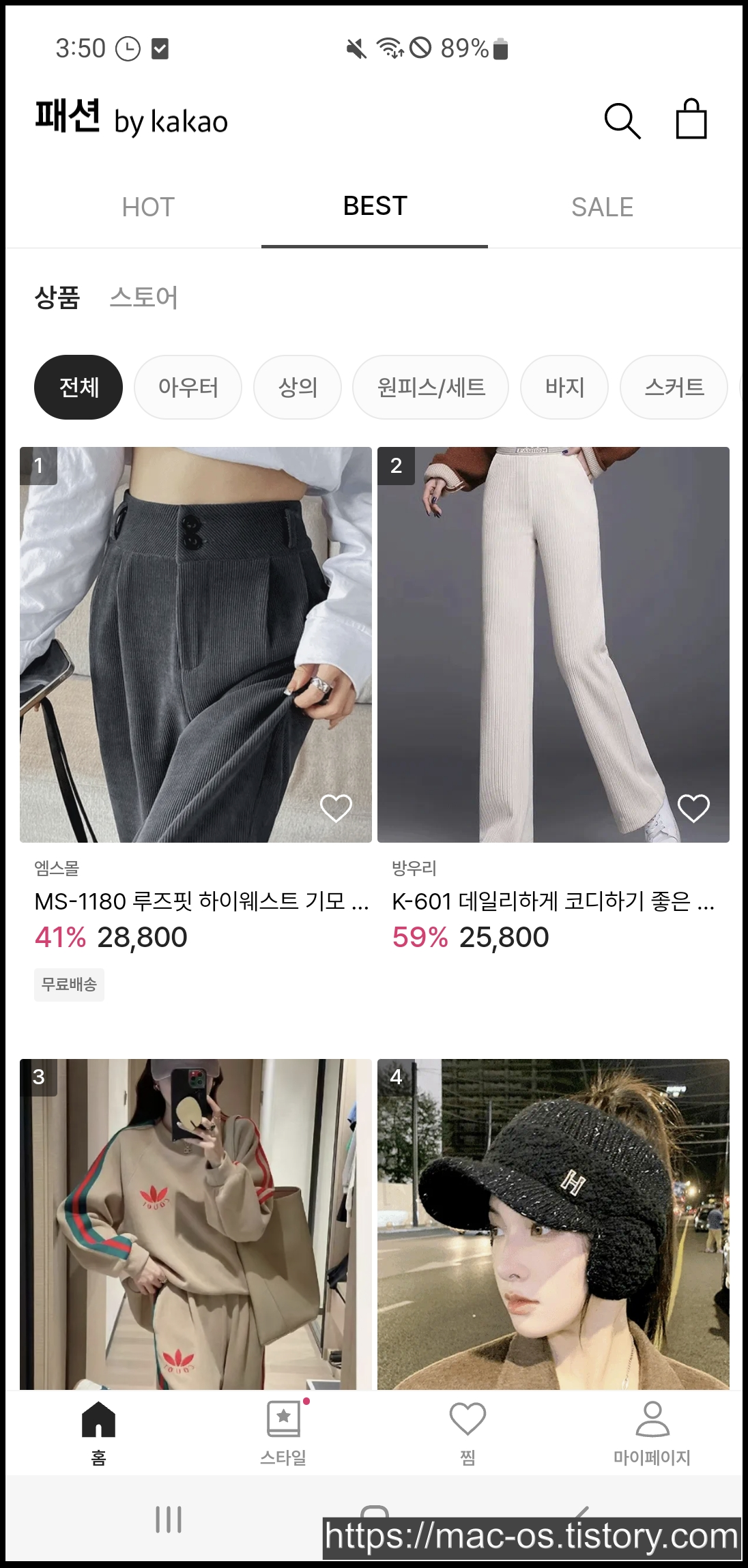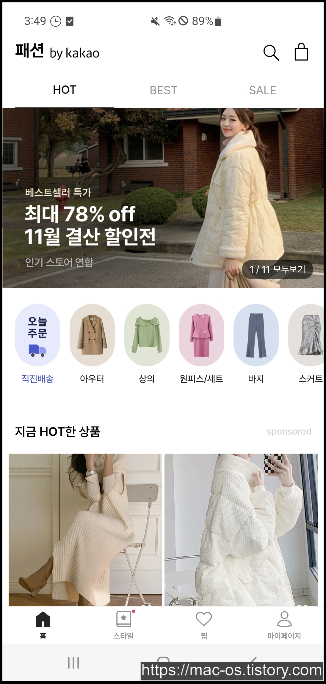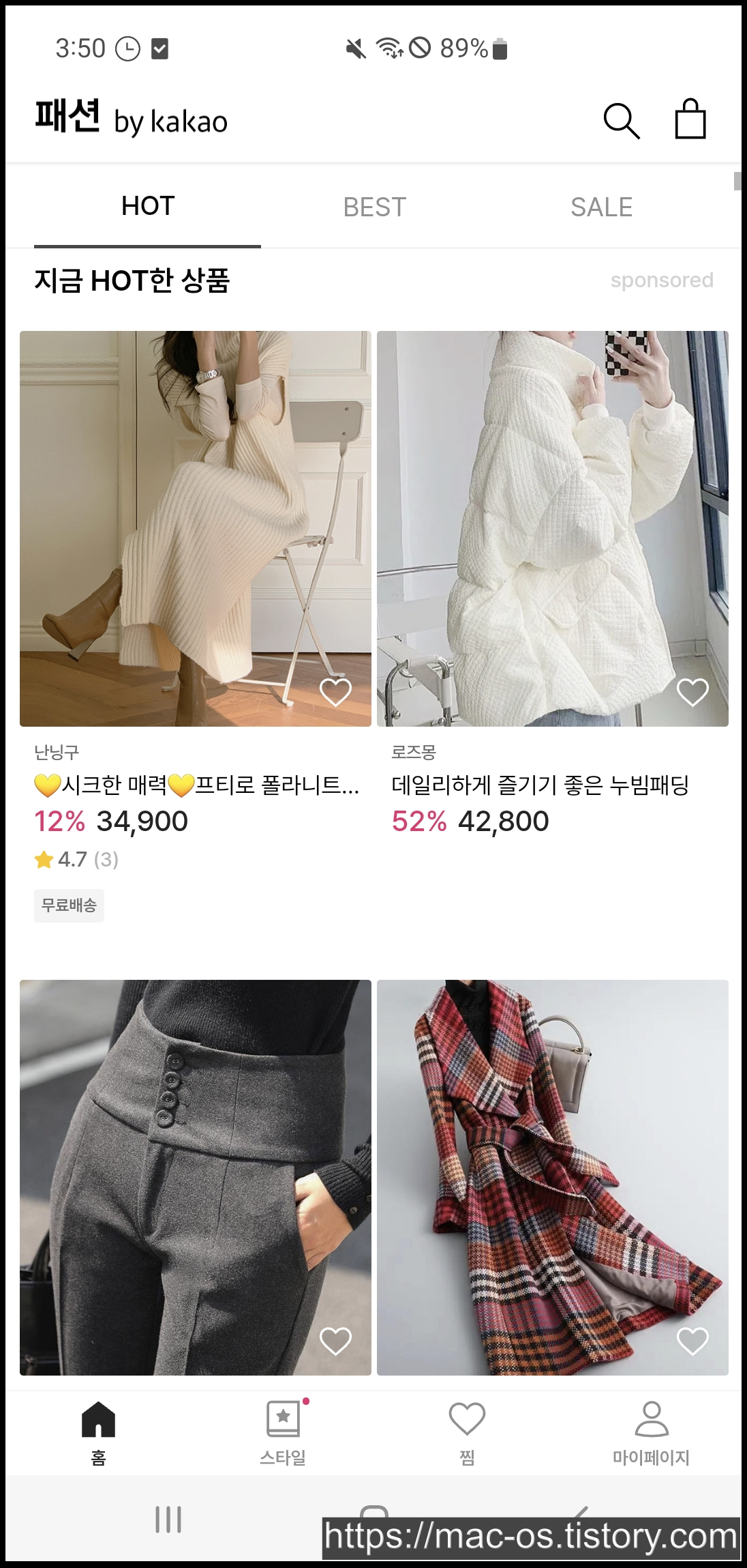 패션바이카카오에서는 HOT, BEST, SALE 3가지의 탭에서 상품을 구경할 수 있어요.