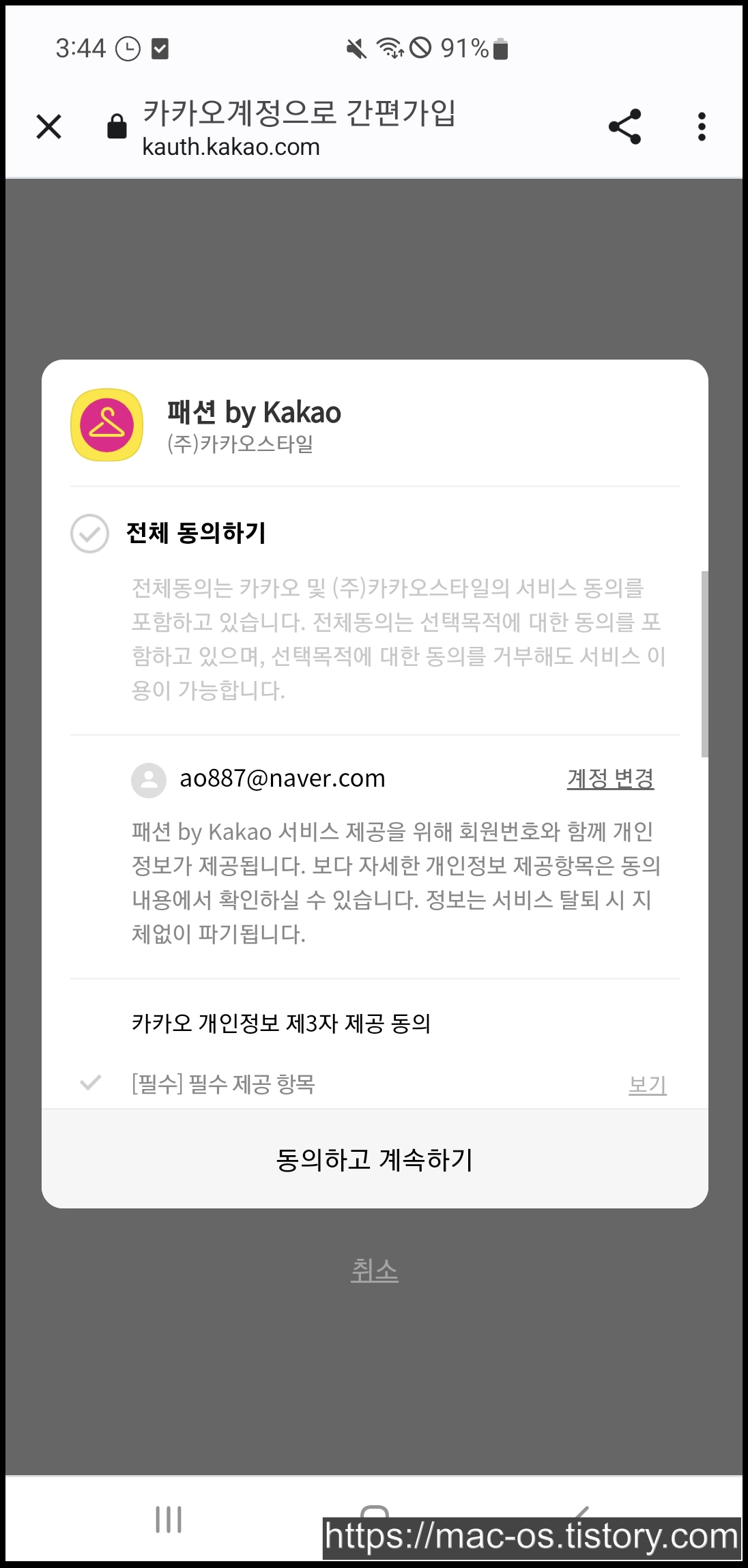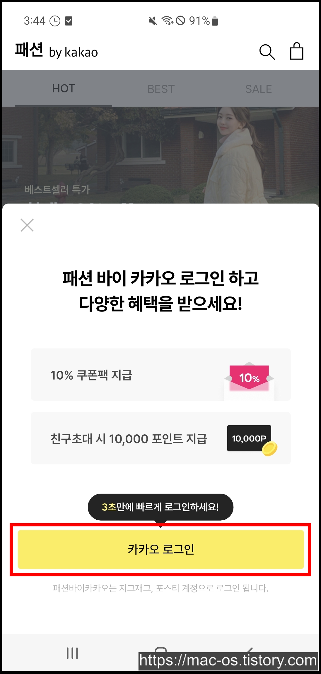 패션바이카카오는 구글 플레이 스토어나 앱스토어에서 설치할 수 있어요. 앱 설치 후 [카카오 로그인]을 터치해 주세요.