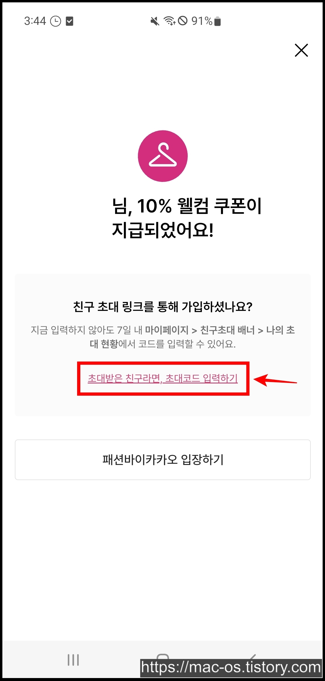 알림창을 닫으면 위 화면과 같이 초대코드를 입력할 수 있는 페이지가 등장하는데요. 여기서 [초대받은 친구라면 초대코드 입력하기]를 터치해주세요.