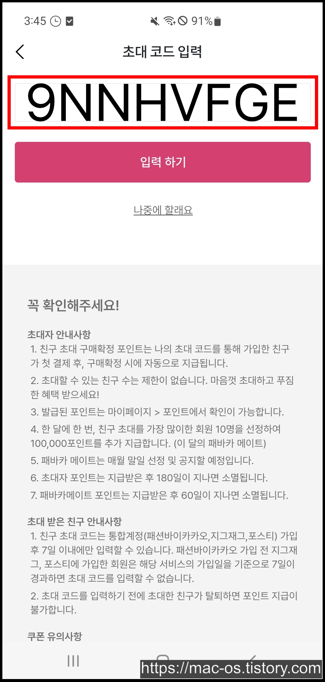 간혹 초대코드를 입력했는데 안되는 경우가 종종 있는데요. 그 경우는 지그재그나 포스티에 이미 가입한 회원이기 때문이라고 하네요. 이 경우엔 초대코드를 입력할 수 없어요.