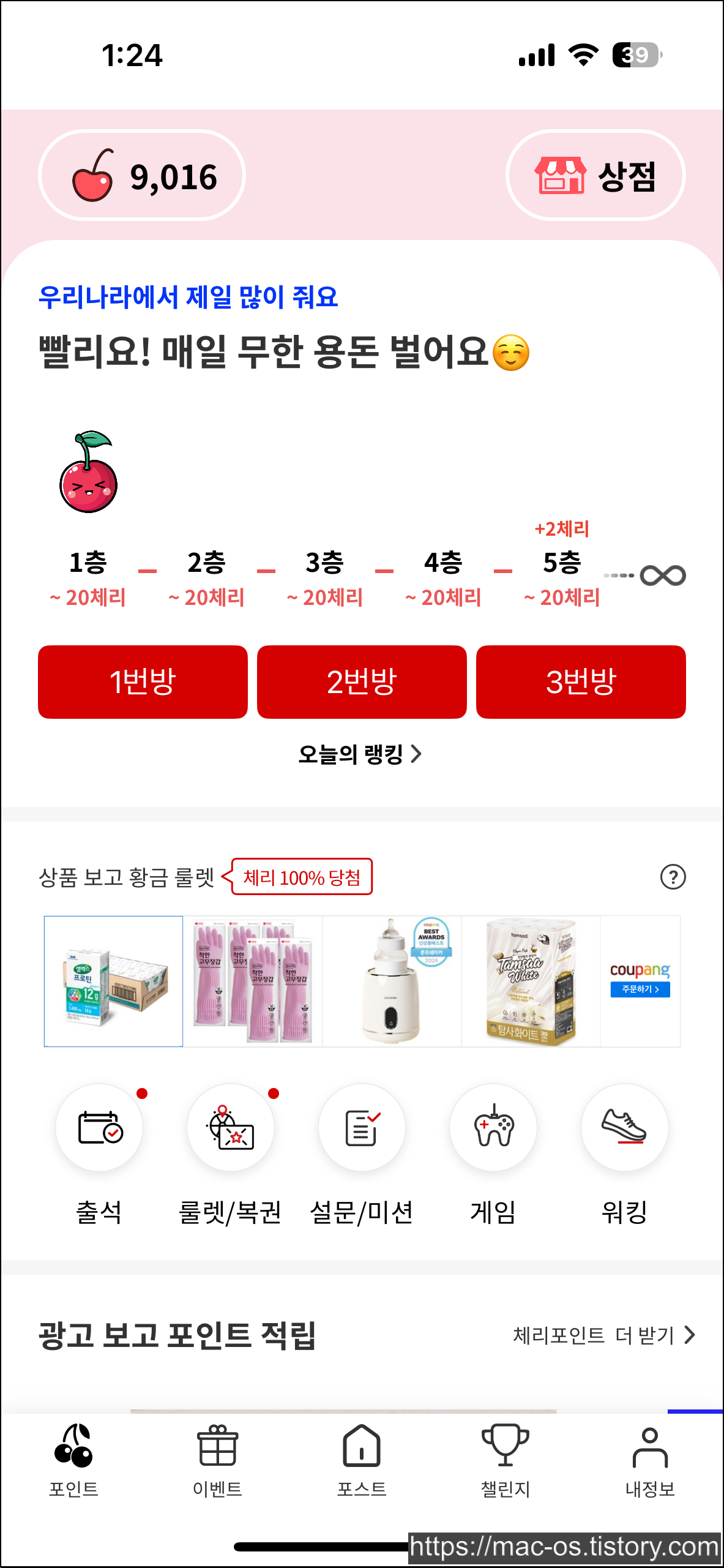 체리포인트는 광고+설문+이벤트+만보기