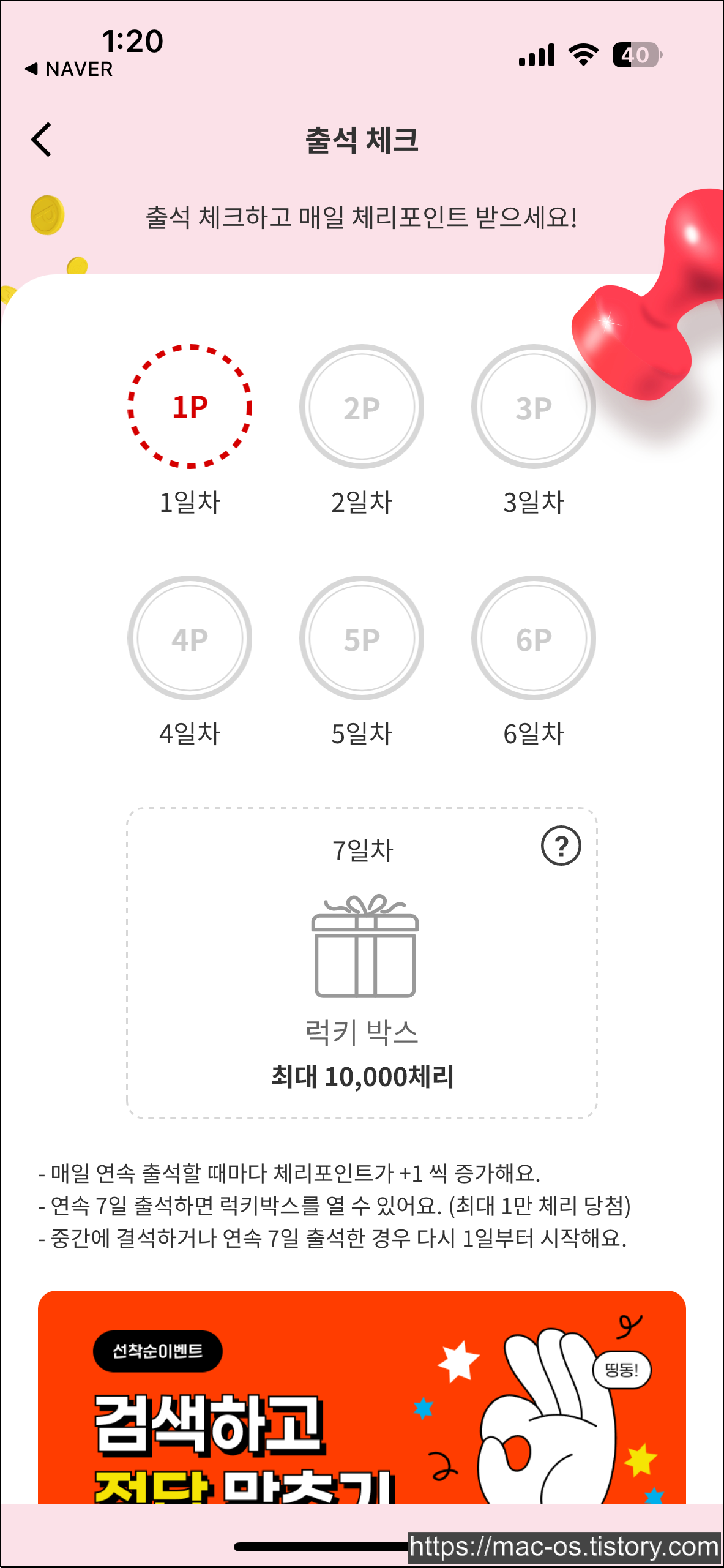 연속 7일 출석체크하면 최대 1만 포인트까지 나오는
