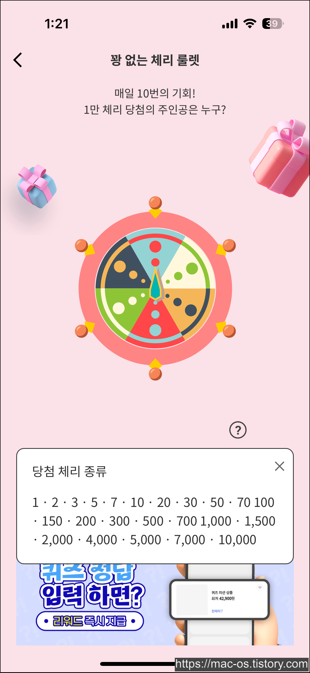 체리 룰렛은 매일 10번 돌릴 수 있고, 룰렛에서