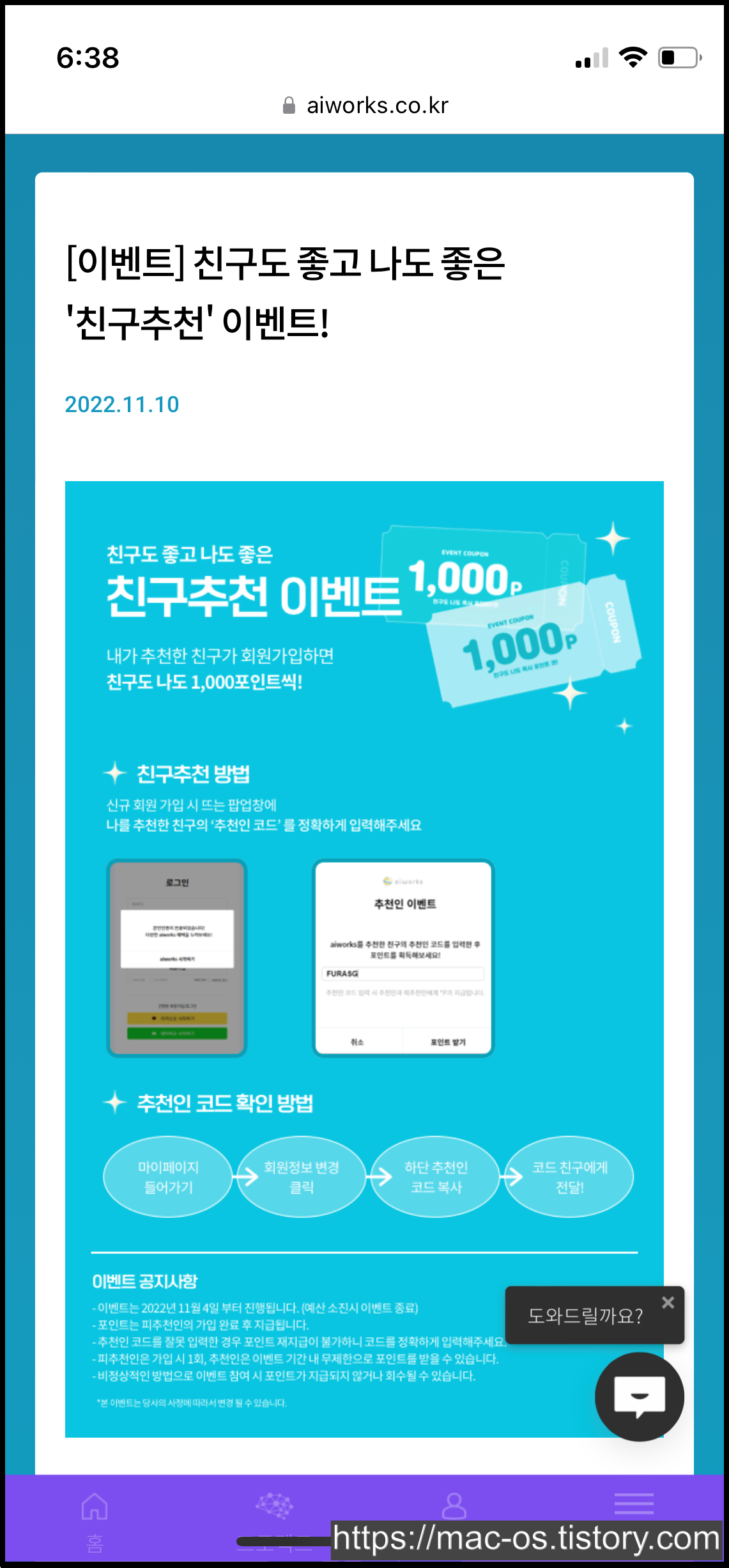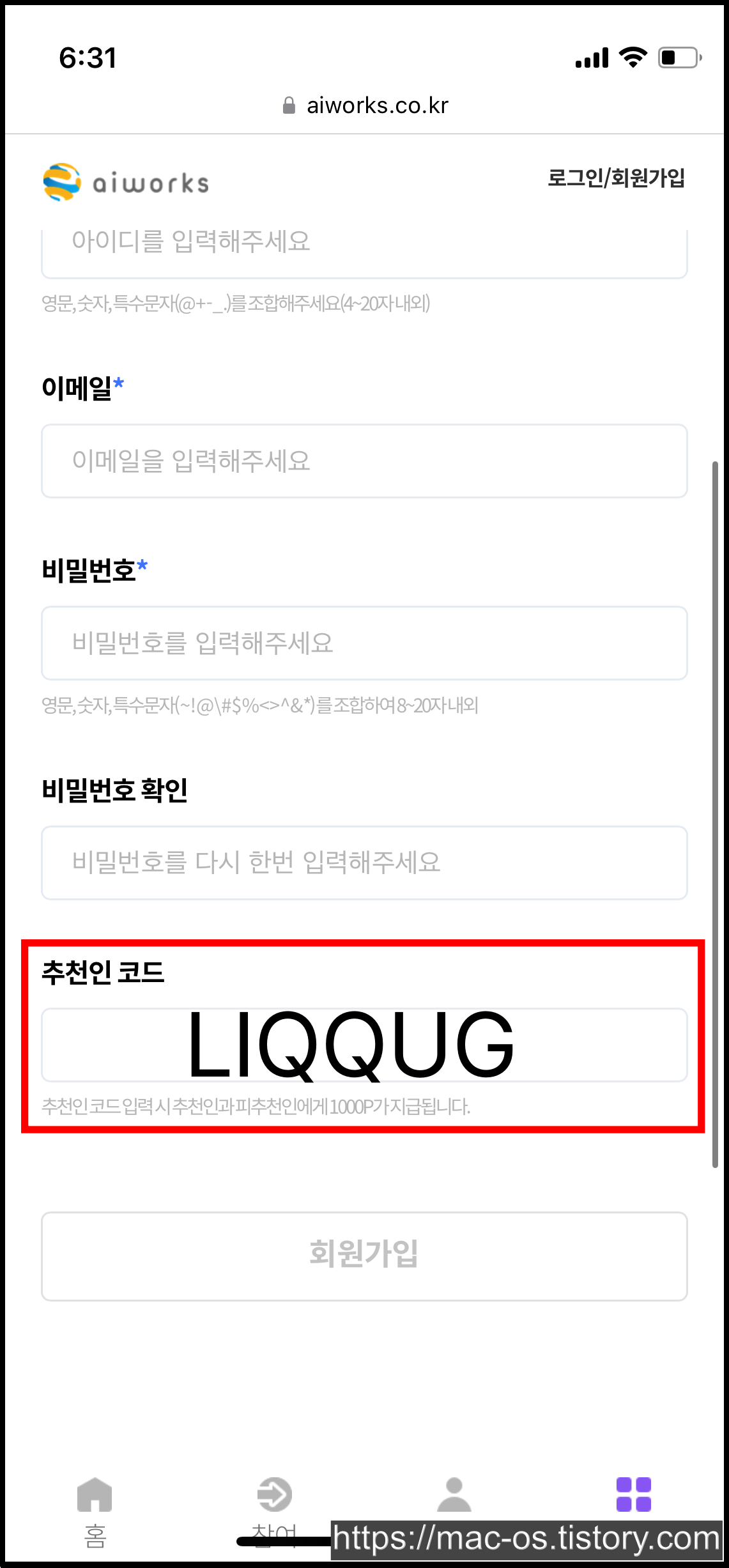 현재 회원가입 페이지에서 추천인을 입력하면 신규회원과 추천인 모두에게 1,000포인트가 지급된다. 입력하지 않고 비어둔 채로 넘어가면 0원부터 시작하니 꼭 입력하자~!!